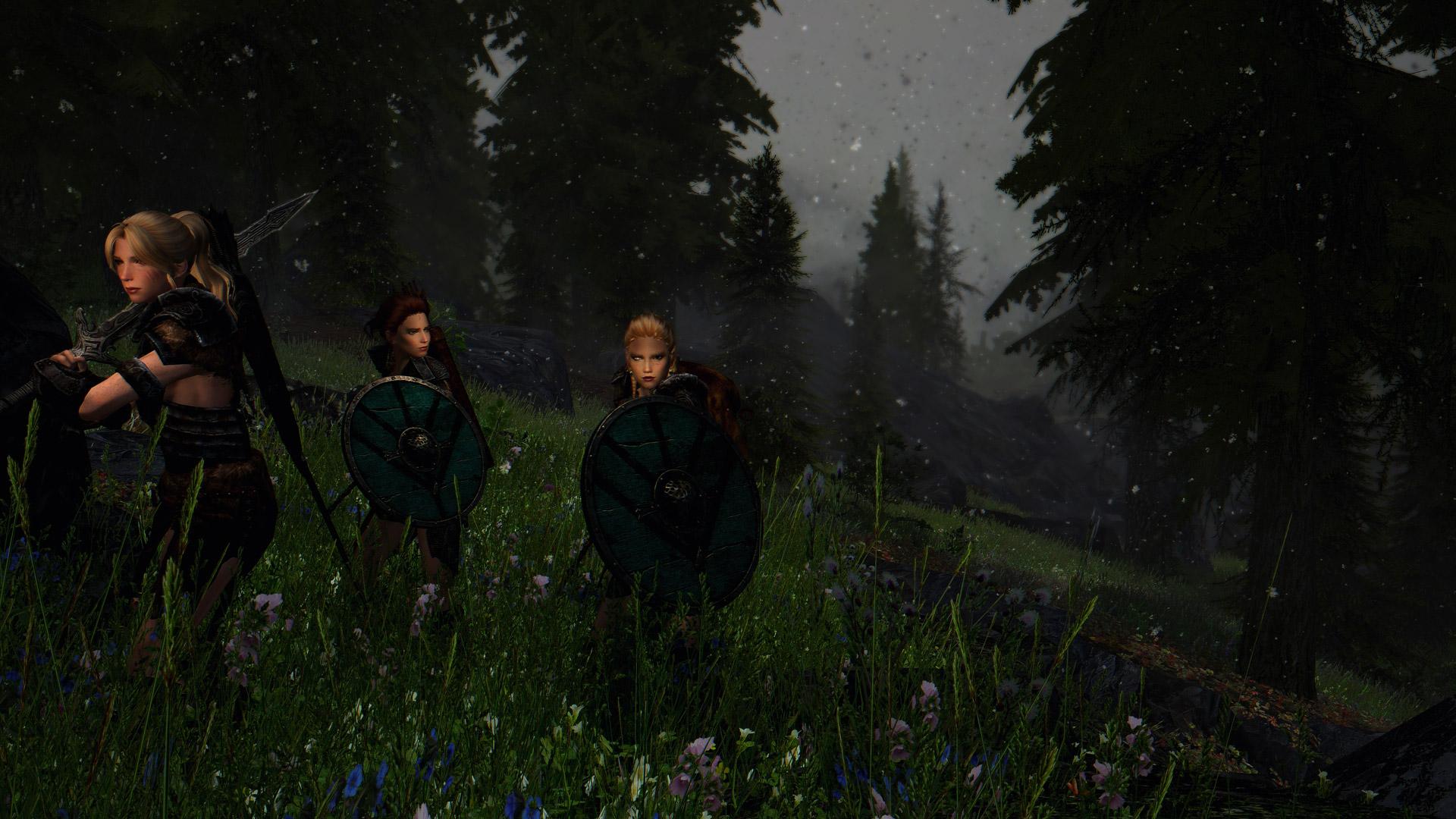 Unterwegs nach Mzulft, Talvi Hadrada mit Tamaria, Nemain und Brelyna im Schlepptau in einer der schönsten Ecken in Himmelsrand.