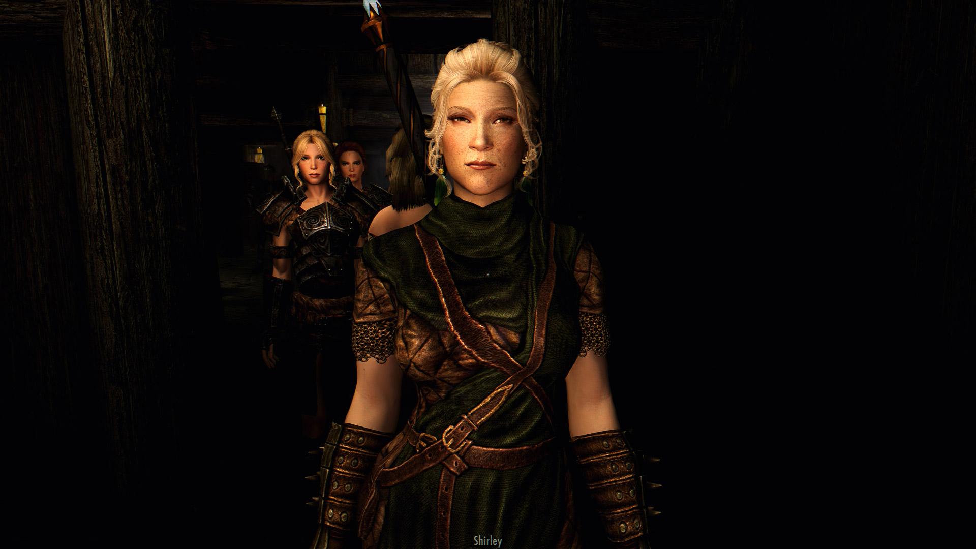 Die letzten Bilder von Oma Shirley, aber drei Begleiter sind genug. Tallvi Hadrada zieht jetzt nur noch mit Mjoll, Tamaria und Nemain rum. Natürlich verstärkt durch meine beschworenen Nord: Lagherta, Brynhildr, Ragnar...