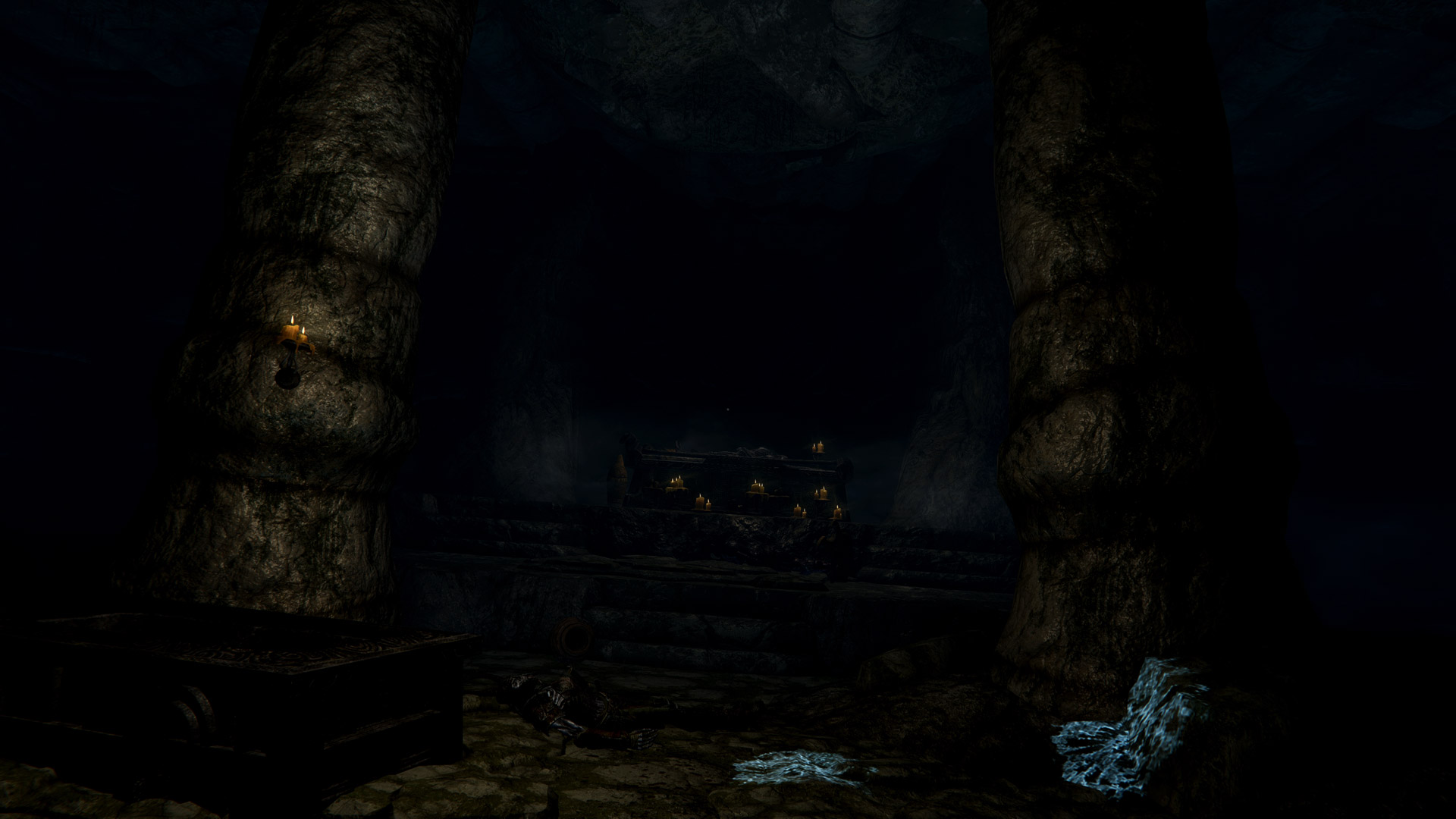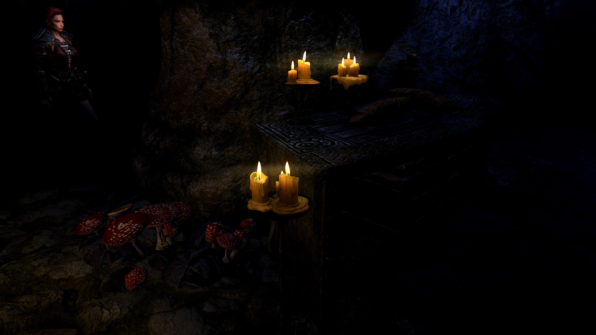 Habe allen Zellen von Wyrmstooth meine Beleuchtungsstile angehängt. Genauso muss es sein. Kalter Stein, warmer Kerzenschein, verrottetes Holz, ein leuchtender Fliegenpilz oder hübsche Potions. Ich weiss nicht mehr, wer der Künstler war, der diese Wandtexturen für Draugr-Gräber gemacht hat. Die haben so einen leichten Schimmer drauf, wie wenn sie feucht wären, passt hervorragend. Auf dem skalierten Screenshot sieht man das vielleicht nicht, aber es sieht fast so aus wie Subsurface Scattering. Und die chromatische Aberration aus Reshade verstärkt das wohl.