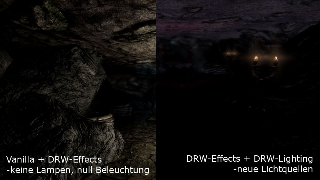Mein Mod macht das Spiel aber auch nicht realistisch, da ich dazu alle Zellen des Spiel völlig neu beleuchten müsste, d.h. zigtausende Streulicht-Quellen deaktivieren oder umplatzieren und dann solange zu schrauben, bis die Beleuchtung eines Draugr-Grabs etwa einem Foto einer Katakombe unter Rom entspricht. Das kann ich nicht und möchte ich nicht. Sowas hätte man zur Entwiclungszeit machen sollen, denn nachträglich geht das nicht mehr.