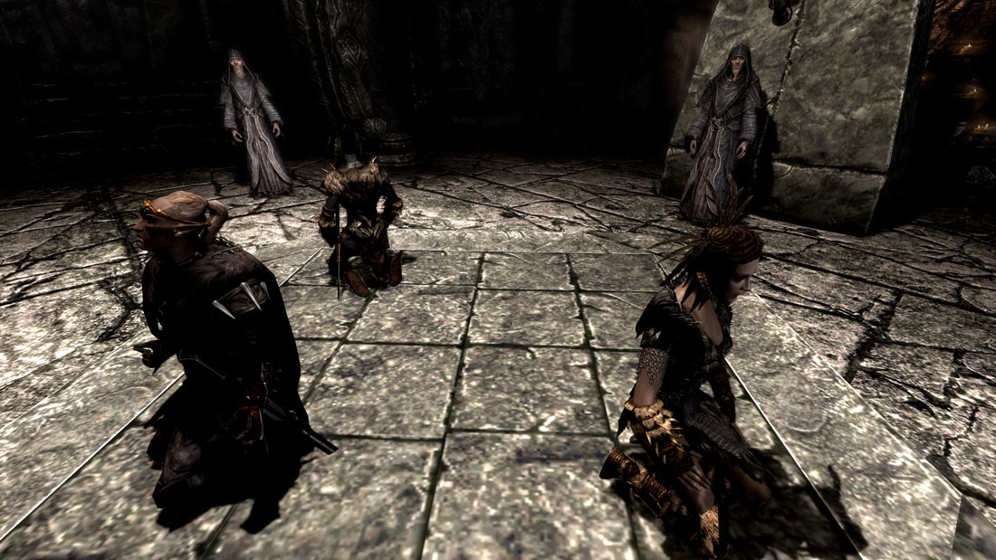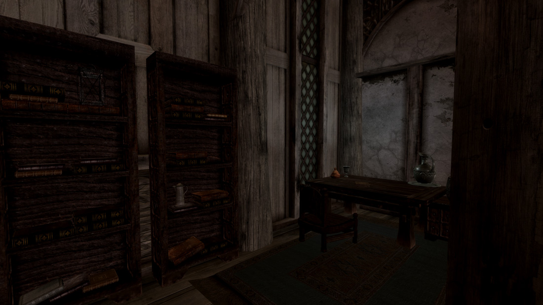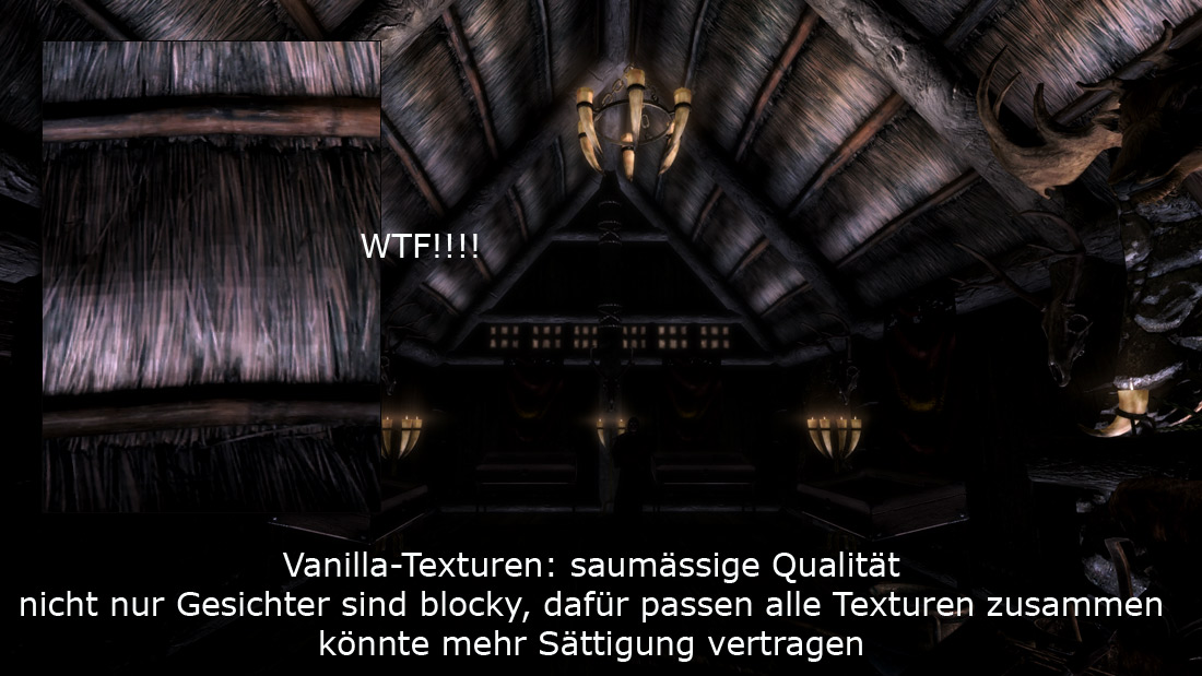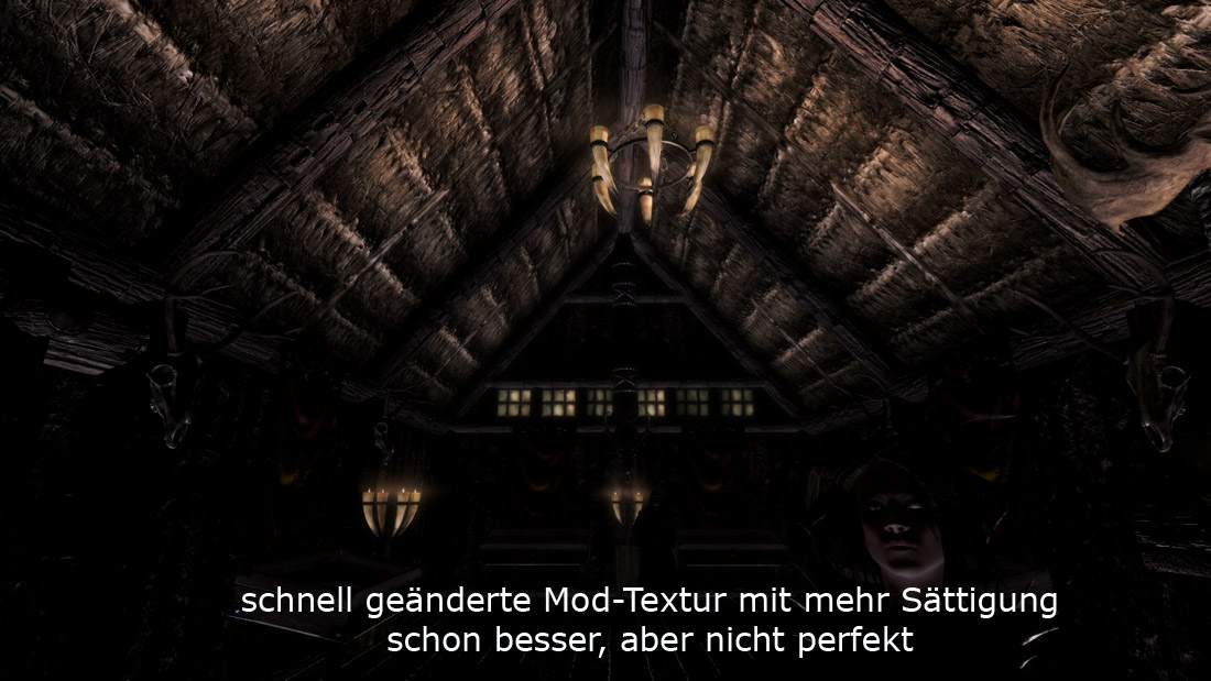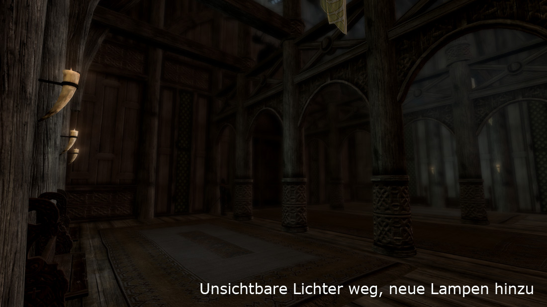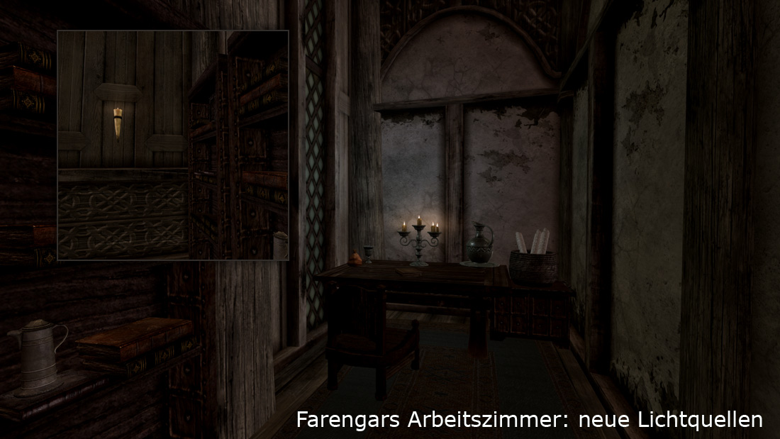 Es ist schon so: wenn man kontrastreiche und angemessen dunkle Filter drauf hat, dann merkt man viel eher, was an der Vanilla-Beleuchtung schief gelaufen ist. So können Räume ohne Fackeln nahezu unbenutzbar werden, wenn man sie dunkler macht und dies, weil es da ganz einfach keine Beleuchtung hat. Ist einem vorher gar nicht aufgefallen, weil die Räume so hell und kontrastlos waren. Ich kann natürlich nicht überall neue Lichtquellen platzieren, aber in der Akademie von Winterfeste und anderen wichtigen Orten werde ich das noch tun.