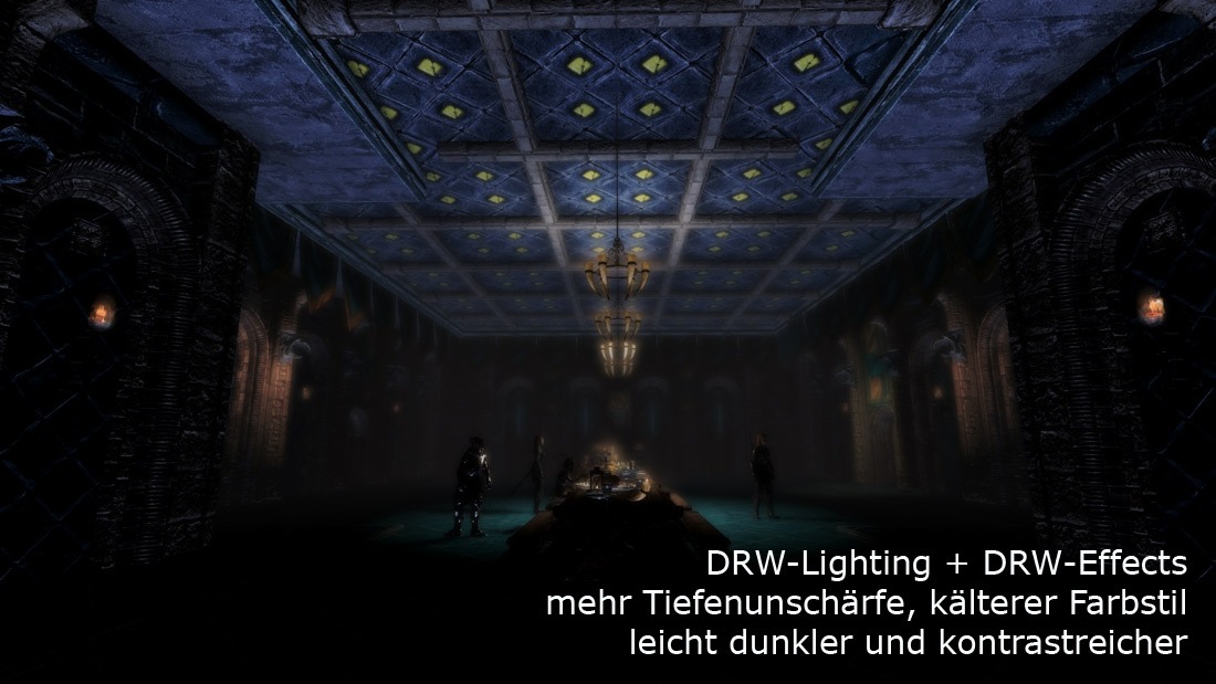 DRW-Lighting ändert keine Quests, Actors oder Scripte, sollte also problemlos verwendbar sein. Es sollten etwa knapp die Hälfte aller Zellen angepasst sein und einige wenige davon haben auch neue Lichter.
