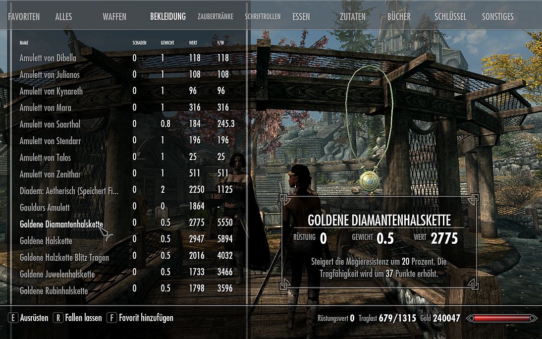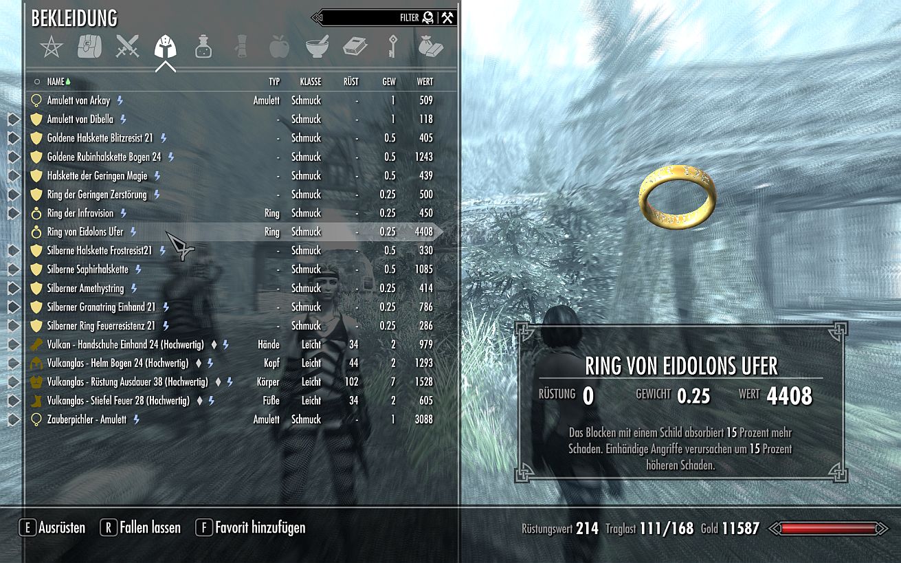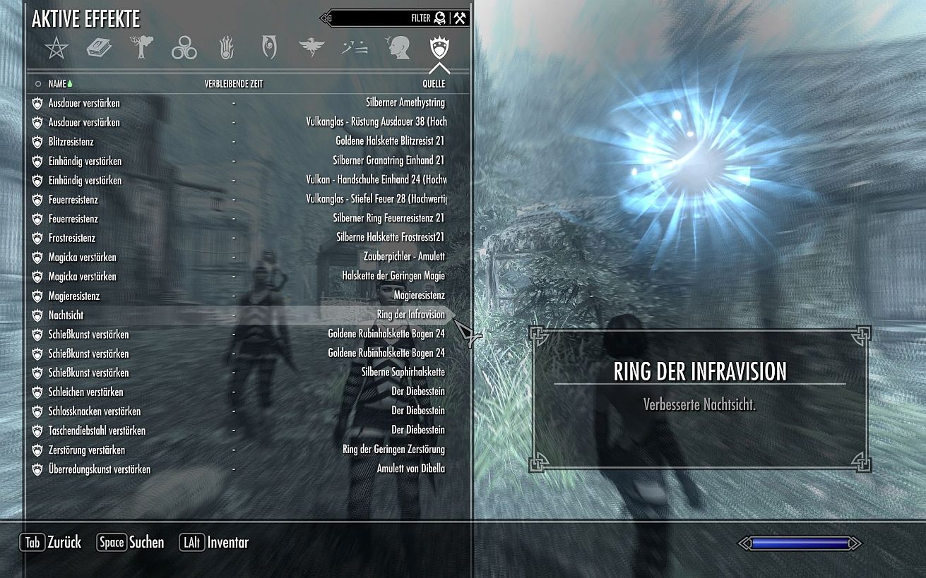 Ich hab den Infravisionsring bei mir als Favorit abgelegt und ihn zunächst darüber angelegt und abgelegt. Hat einwandfrei funktioniert. Dann habe ich ihn im Inventar ausgerüstet und bin ins Spiel zurück. Infravision war an. Darauf zurück ins Inventar und das gute Stück wieder abgelegt. Zurück ins Spiel und... Effekt war weg. Letzter Versuch... im Inventar ausgerüstet und wieder abgelegt. Aha - Effekt war nach verlassen des Inventars immer noch da, ist dann allerdings verschwunden, als ich den Ring via Favoriten nochmal an- und abgelegt hatte. Beim Versuch des erneuten an- und ablegens via Inventar ist der Effekt allerdings geblieben.