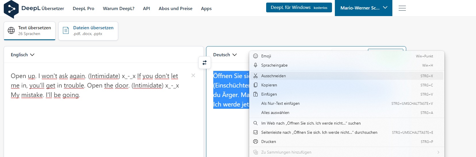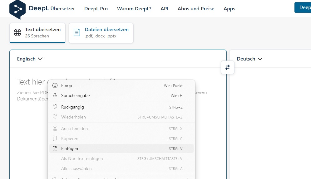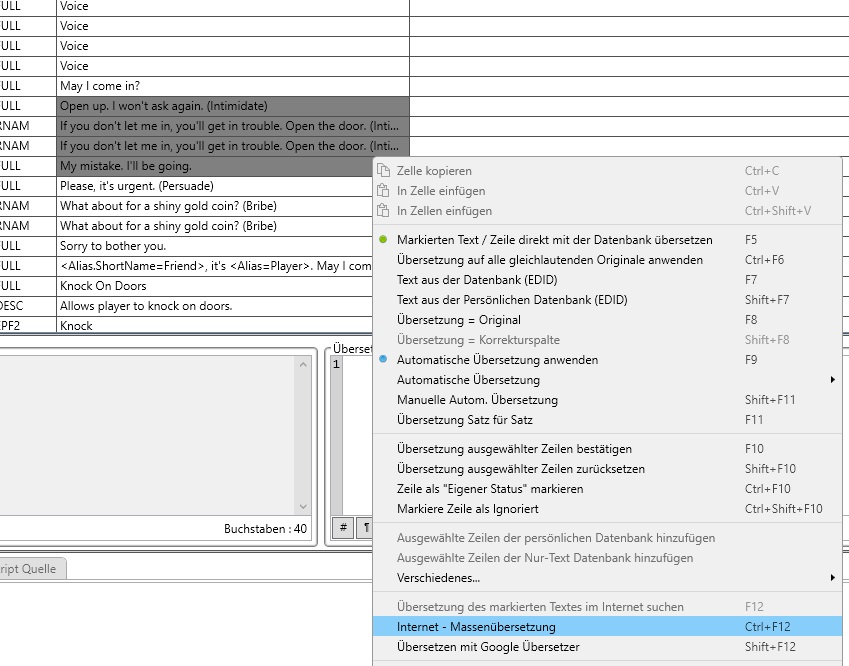Und nein, Shift+F12 gibt es nur mit Google, da DeepL keine kostenlose API dafür bietet. Du aber immerhin mit F12 den Text nach DeepL kopieren, oder mit CTRL (STRG) + F12 die Massenübersetzung der ausgewählten Zeilen starten.