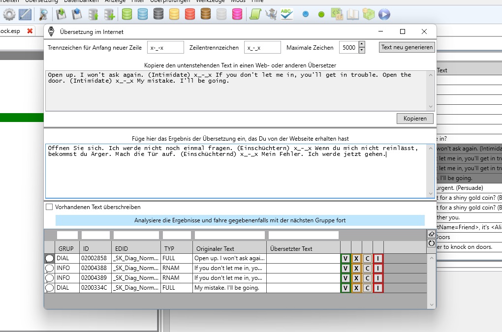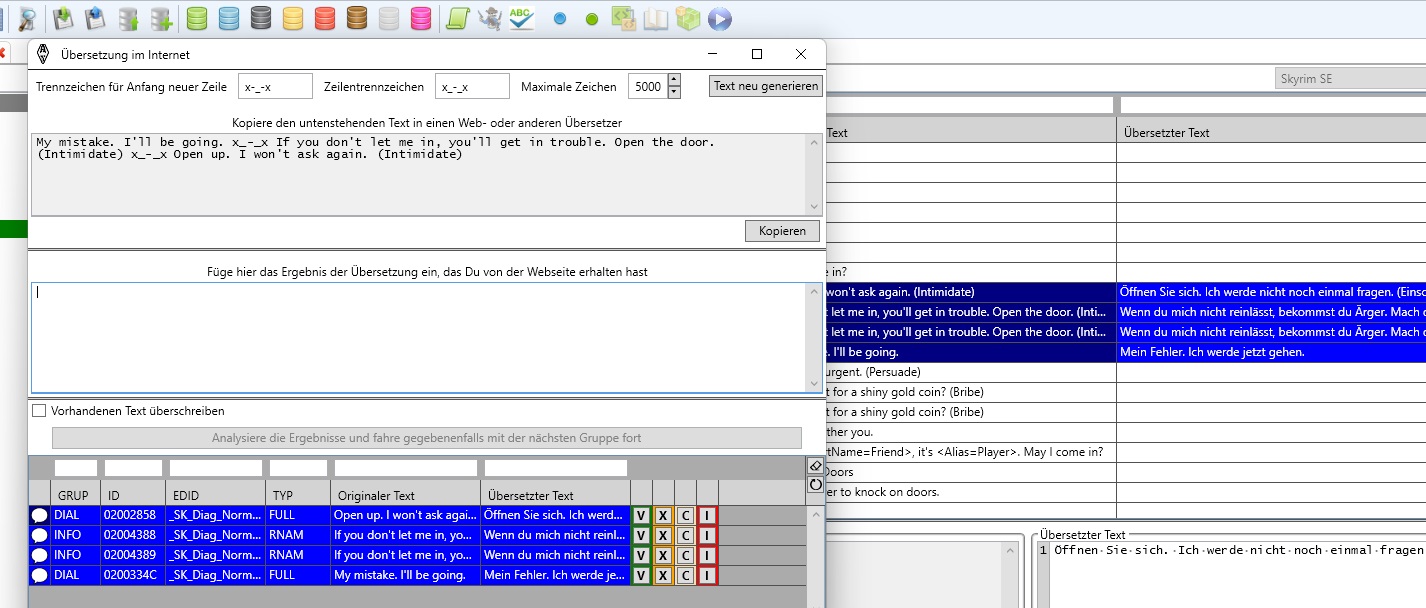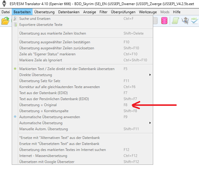 Ich habe die Deutsche Übersetzung von 4.02 fertig, und auch aktuelle Datenbanken von Skyrim SE 1.5.97 mit dem SSEDC 1.8 (Kommt bald ^^) und dem USSEP 4.2.5 erstellt.