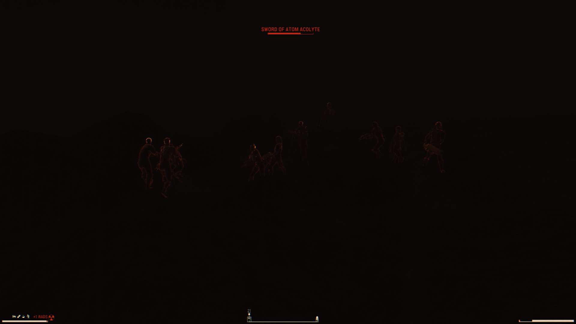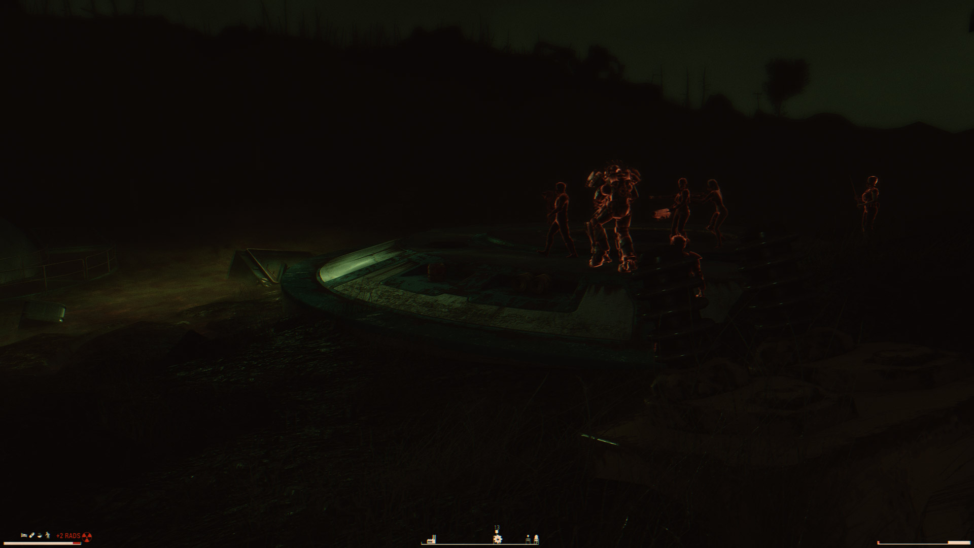 Ich glaube, ich muss zuerst mal diese Mod entschärfen, die Kopfschüsse gegenüber sonstigen Treffern bevorzugt, d.h. es ist schwerer zu verletzten, wenn man nicht den Kopf trifft. Möglicherweise führt das dazu, dass Schüsse in die Beine der Ghule kaum Wirkung zeigen, eventuell betrifft das sogar Minen. Ich meine, in der Realität könnte dich ein eigentlich ungefährlicher Streifschuss in den Fuss alleine durch den Schock töten. Hier aber laufen die schwereren Gegner einfach so durch Minen durch, die immerhin alle kleinen plätten. Und ein Schuss in den Kopf ist tödlich, sonst muss ich ein Magazin reinpumpen.Wobei die Nightkins hier eine besondere Herausforderung sind. Ich habe den Stealth-Effekt ganz leicht entschärft, sodass man eine Chance hat, sie zu entdecken. Aber weil man sie nicht genau genug sieht, trifft man auch keine Köpfe, was jedes Mal zu einem Rückzugsgefecht mit wildem Geballer führt.