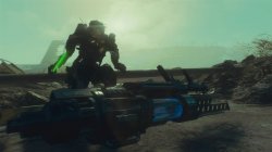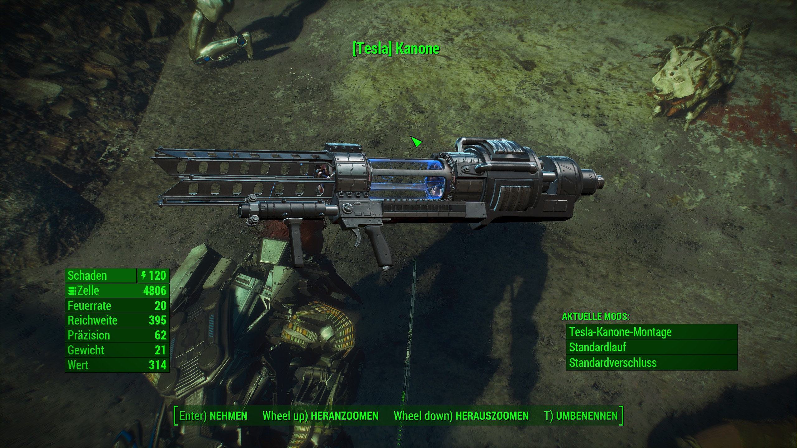 Um zur Waffe zu gelangen, braucht man eine Powerrüstung mit speziellen Modifikationen. Als mein Charakter in die Rüstung schlüpfte und in die Third-Person-Ansicht wechselte, spielte die Kamera verrückt, genauer gesagt blieb diese auf dem Boden, egal was ich machte. Ich war fest davon überzeugt, dass es sich um einen Modkonflikt handelte. Um dies zu testen, wollte ich alle Mods deaktivieren und schrittweise wieder aktivieren, um die schuldige Mod zu finden. Blöderweise stürzte das Spiel beim Laden des Saves ab nachdem ich alle Mods deaktiviert hatte. Es stellte sich heraus, dass das Deaktivieren von Portable World Space die Ursache des Absturzes war. Die Mod For the Droids verursachte die Probleme mit der Kamera beim Benutzen der Powerrüstung. In den Kommentaren zur Mod fand ich schließlich die Lösung: Die Animationsmod benötigt die Custom Camera Mod.