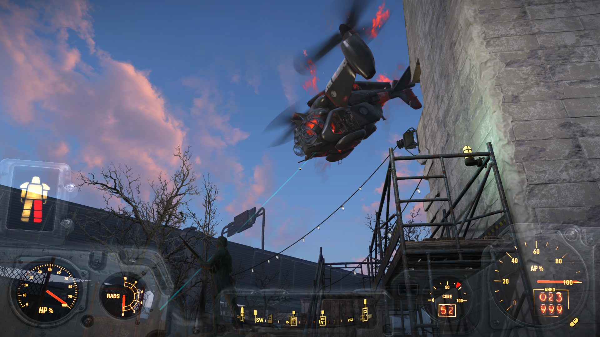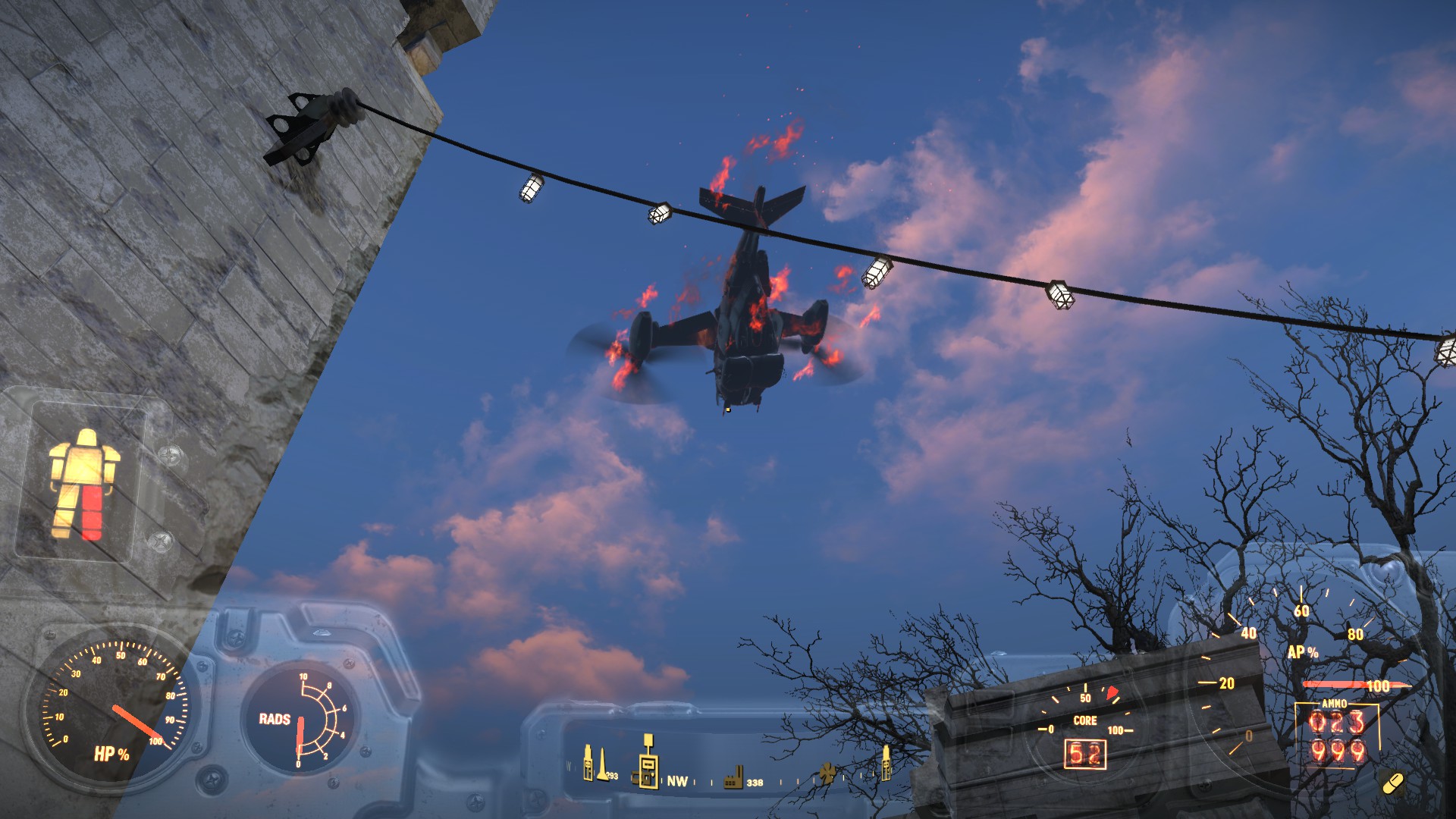 Ach, ja, das Beste zum Schluss: Es gibt eine Powerrüstung in der Nähe zu finden, gleich neben einem abgestürzten Vertibird: