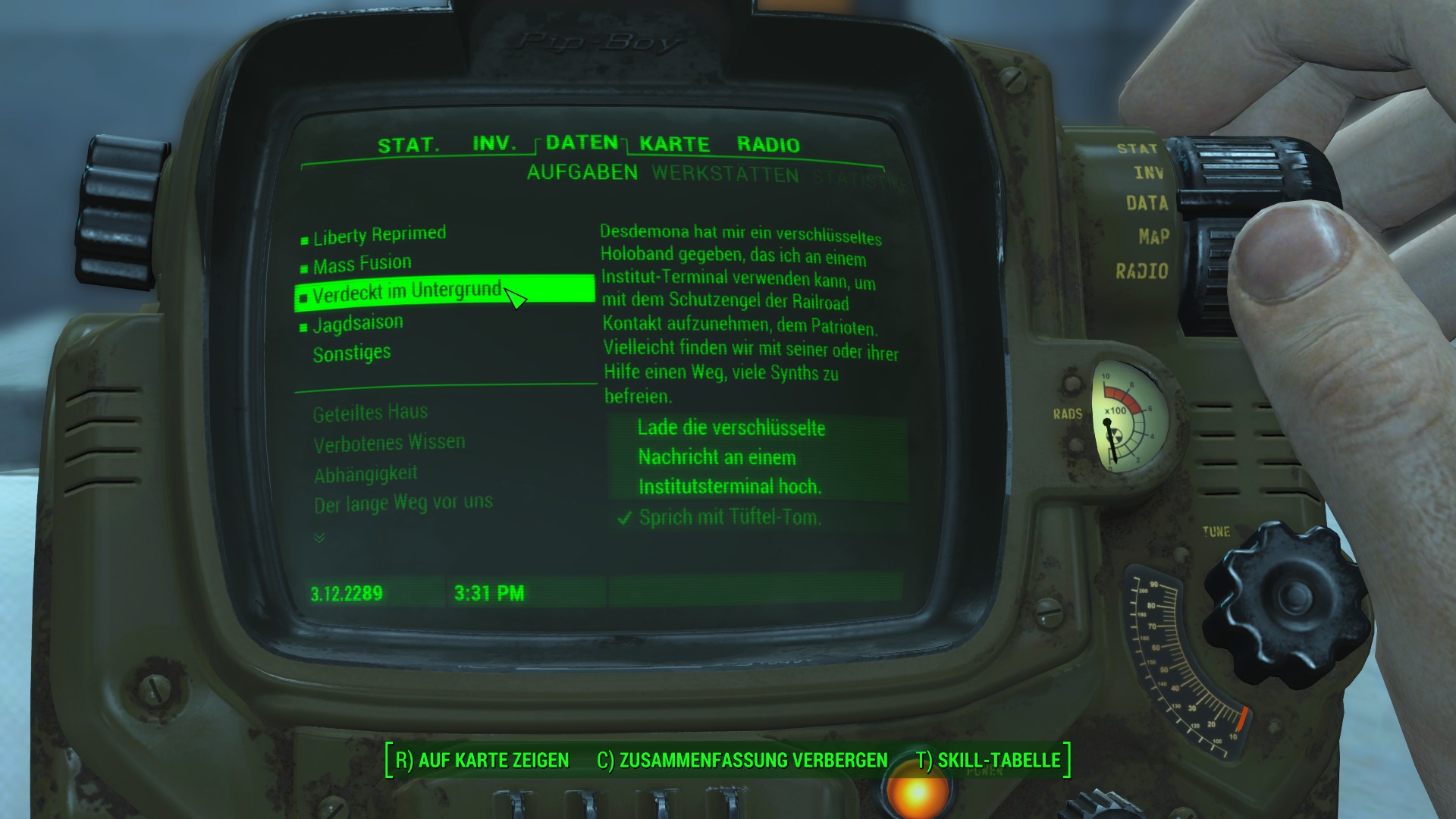 Ich war im Institut unterwegs, um an der Ratssitzung teilzunehmen. Auf meinen Schlenderwegen traf ich einen NPC, dem ich von Acadia erzählt habe. Ich dachte: "Okay, lass mal laufen, ich werde DiMa & Co. dann vorher warnen und die Institutler beseitigen." Tja...ging aber nicht, die Synths waren bei meiner Ankunft in Acadia schon auf Krawall gebürstet, ich musste also meine Haut retten...dumm gelaufen!