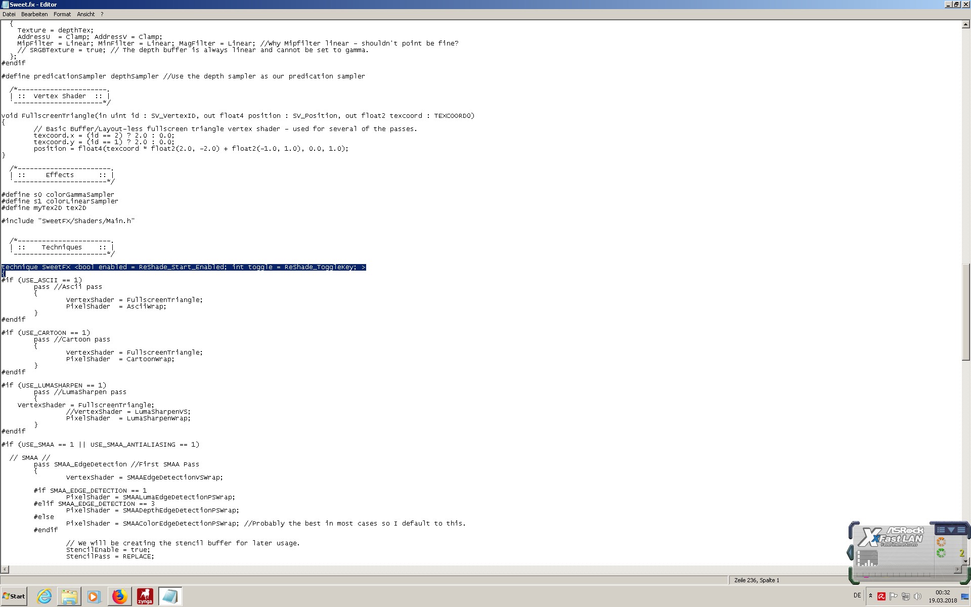Zu der Fehlermeldung: Ich sehe da so erst mal keinen Fehler sondern den Hinweis das SweetFX gebootet wird (Boot enabled) und das es einen ToggleKey (ToggleKey enabled) nutzen kann. Bei meiner Version von Reshade ist es die Taste Entf Ich kann damit dann InGame die Effekte ein-oder ausschalten. Bei sehr dunklen (Grundspiel) Interiors die durch Reshade noch dunkler gemacht werden ist das schon mal sinnvoll die Effekte kurzzeitig auszuschalten---es sei denn man hat eine extrem helle Helmlampe an der PA oder als PipBoy Licht