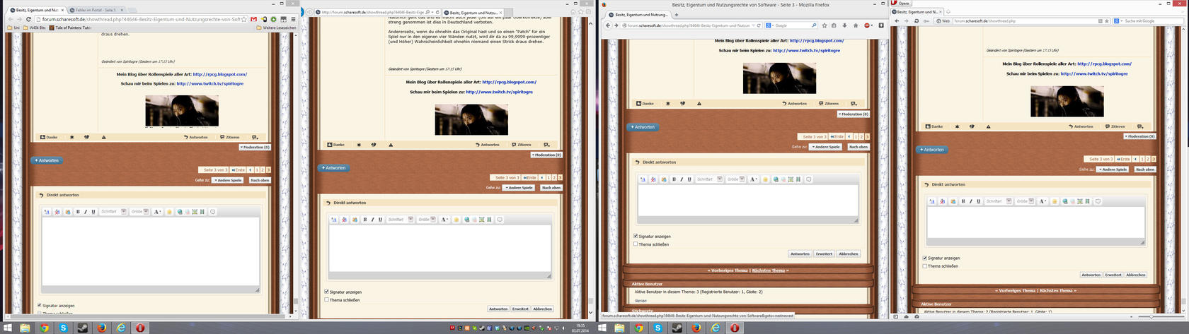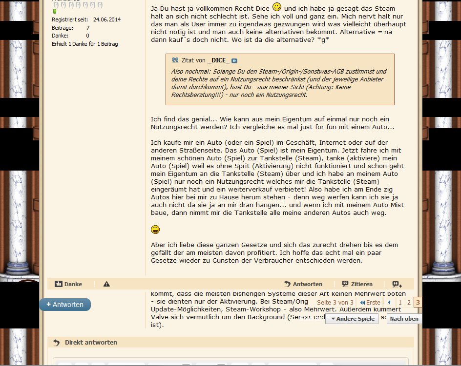 Es liegt wahrscheinlich an meinen Einstellungen (schmaler Browser, viele Beiträge auf jeder Seite): Im Thema Besitz, Eigentum und Nutzungsrechte von Software ist die Hintergrundgraphik zerschossen.