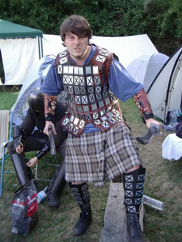 Ähem... Rüstung hab ich vor selber zu bauen. Also nur den Harnisch. Der soll dann möglichst einfach gehalten sein (4.5cm*3cmStahlplättchen auf Leder genietet), also ohne Ärmel un bis knapp zu den Knien.