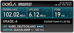 Ping und Download deiner 100 Mbit-Leitung sind ja auch gut, aber der Upload ist mit nichtmal 13% völlig unterirdisch (für Kabel Deutschland aber leider völlig normal). Wäre das absolute K.O.-Kriterium für mich.