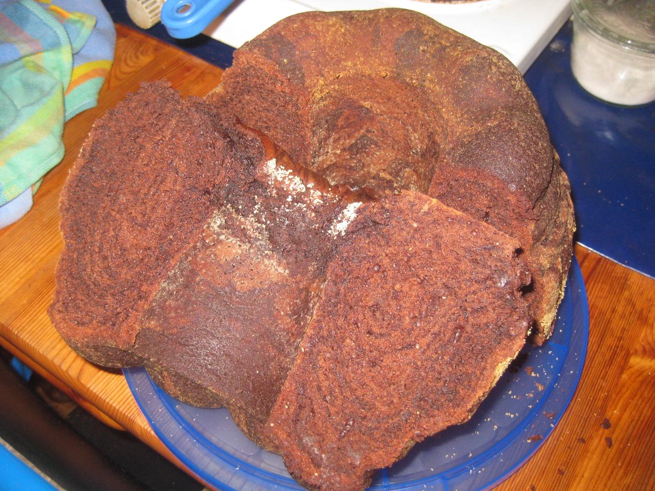 5.: Nun die vorher gerichtete Portion Kakaopulver vorsichtig und sorgfältig in den Teig einarbeiten bis er gleichmäßig dunkel gefärbt ist.