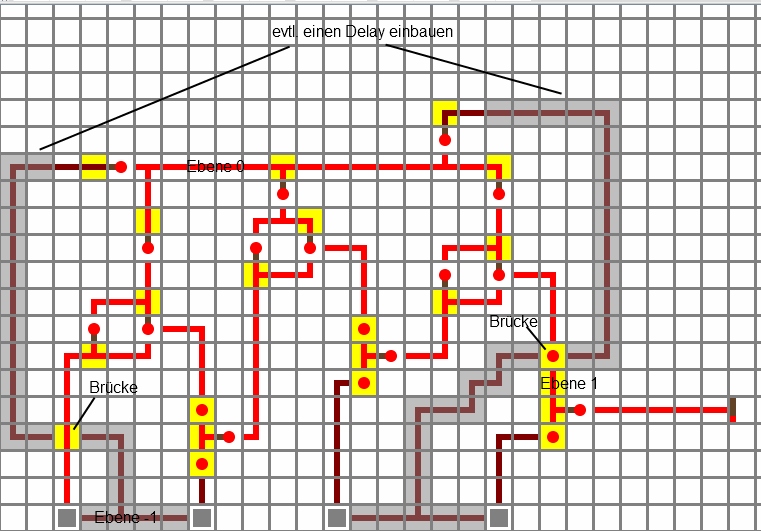 Ich hab doch eh die Ebenen beschriftet: Das graue ist sozusagen "im Keller", also unter den Druckplatten. Das weiße ist auf Druckplattenebene. Und das gelbe ist eins drüber (Also ein Block nach oben). Übrigens hab ich eins vergessen: Zwischen dem AND-Baustein und dem Speicher muss noch ein Delay seinm der länger braucht als der Delay auf der Deaktivierungsstrecke.
