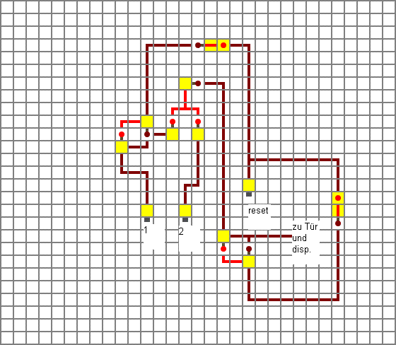 Naja, ich gehe davon aus, du weisst, was ein AND macht und wie er funktioniert. Was du siehst sind ja eigentlich nur zwei AND-Bausteine. Wenn du den Hebel aktivierst, wird immer entweder der rechte oder der linke AND ausgelöst (Garantiert durch das NOT auf der rechten Leitung); je nach dem, ob der Code stimmt.