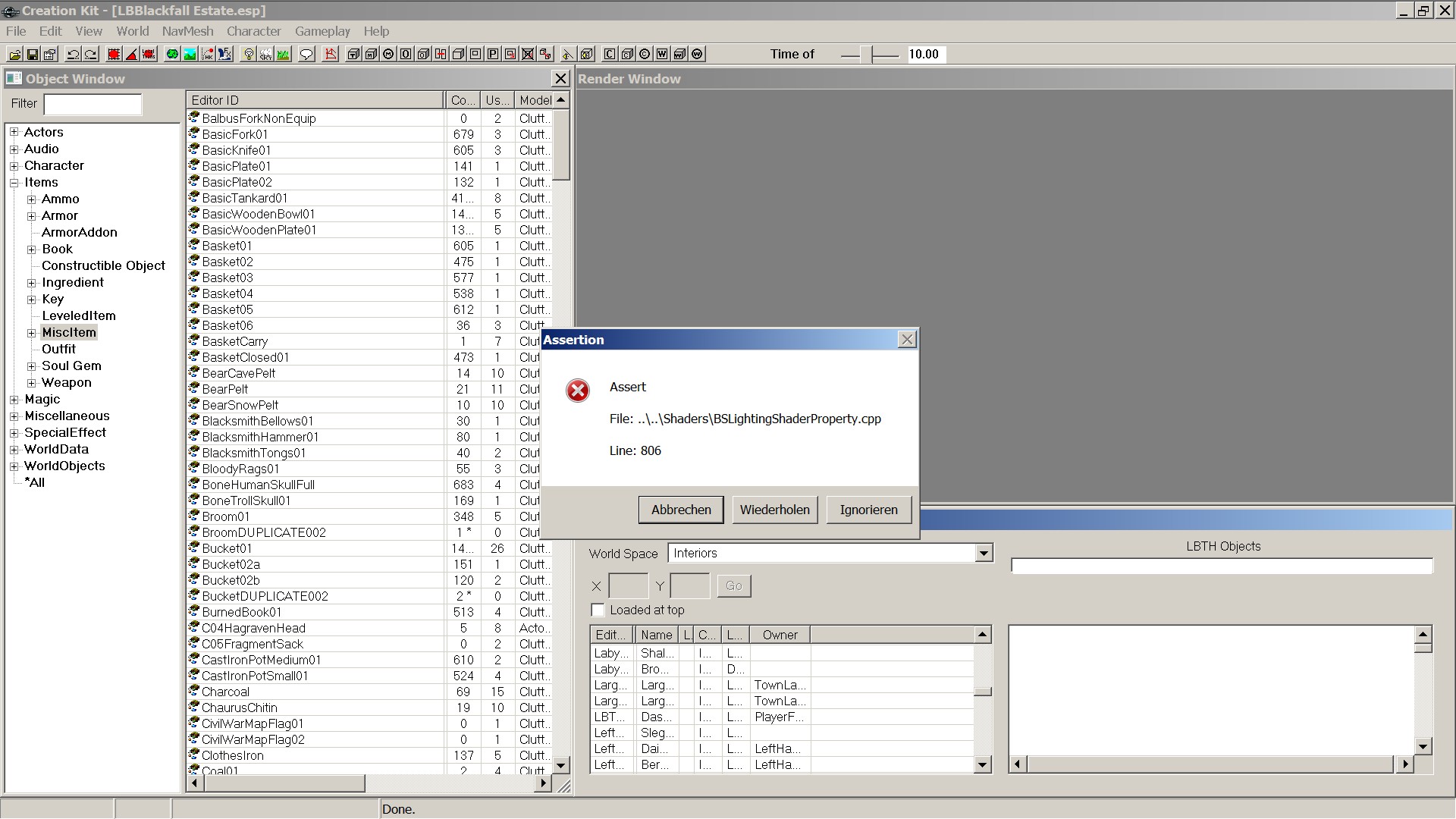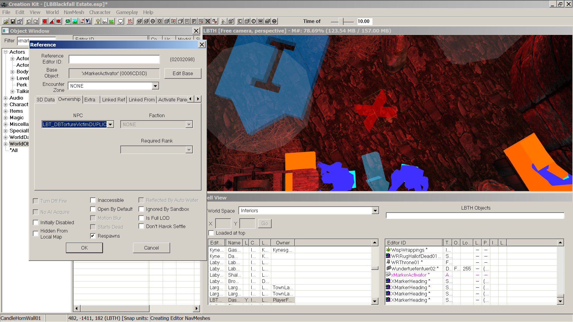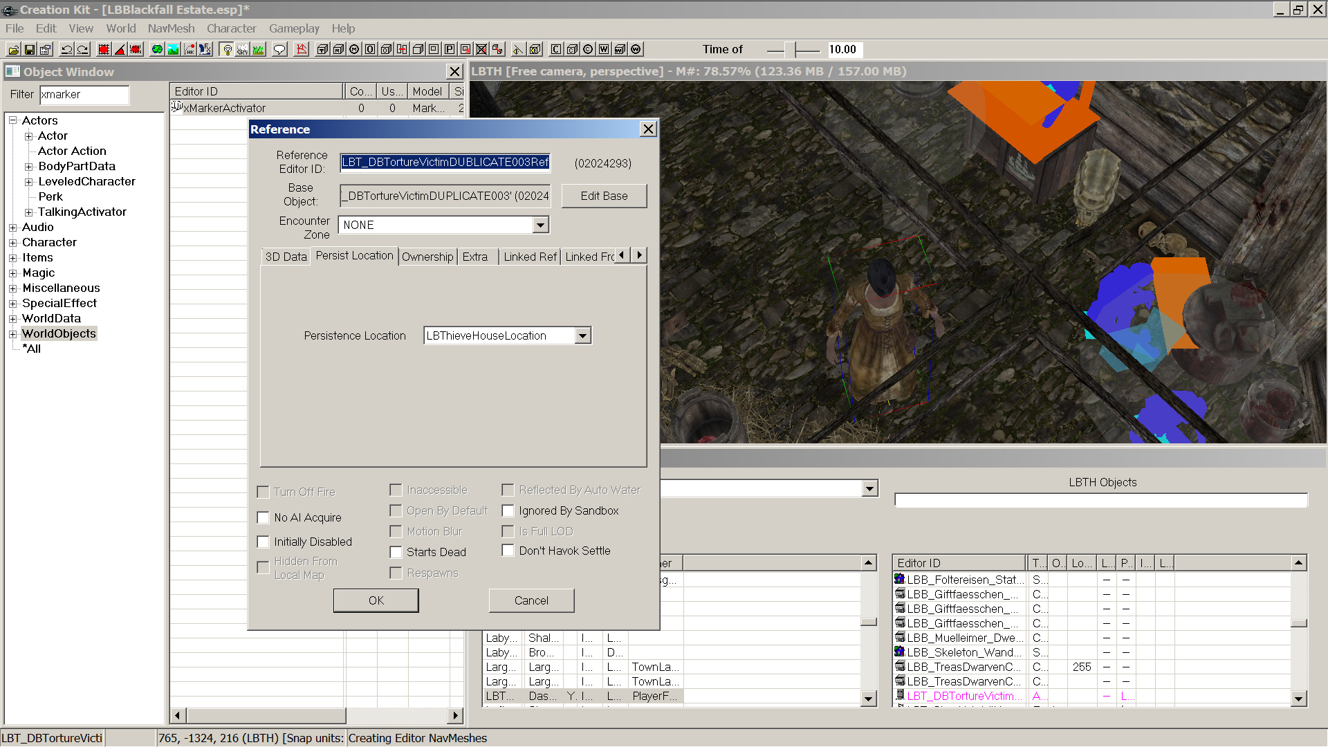 Inzwischen habe ich das Creation Kit schon nicht mehr installiert und das liegt jetzt alles schon etwas zurück. Ich habe bemerkt dass ich beim erstellen des Hauses eine Fluchttür übersehen habe, die jetzt einsam und verlassen in Einsamkeit (der Pampa) herumgammelt. Man kann die Fluchttüre sogar anklicken aber da dieser keine Funktion mehr zugeordnet ist passiert nichts (außer dass dort dann Tür auf/Tür zu im Wechsel steht). Kann ich die irgendwie per TES5Edit löschen? Ich finde die da nicht wirklich, gibt es da eine Kategorie?