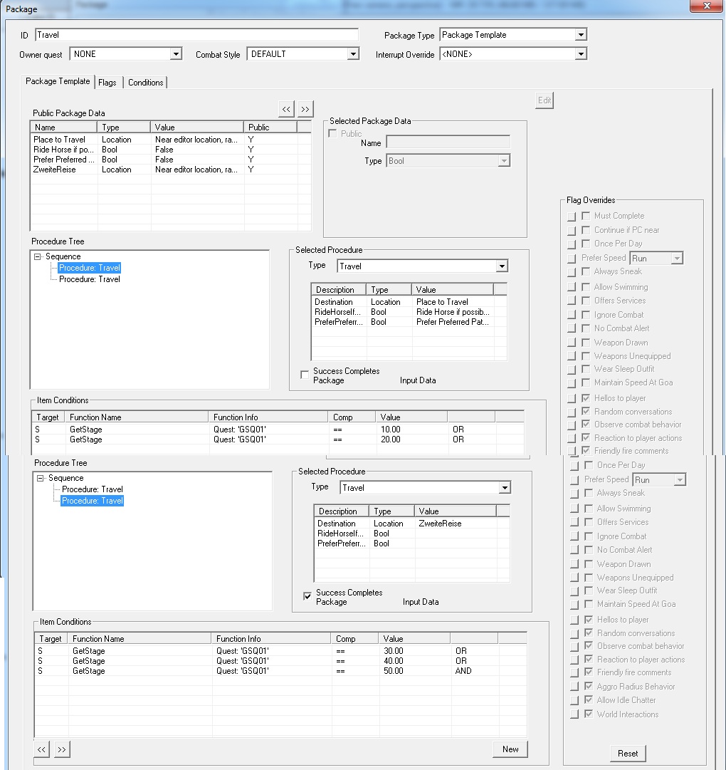 Ich habe das mit einem Package "Travel" versucht. Die erste Wanderung klappt wunderbar. Die Bedingungen, die ich eingegeben habe, stimmen also. (GetIsID == 10 OR GetIsID == 20). Leider setzt sich der NPC dann aber nicht in Richtung C in Bewegung. Die Bedingung, die ich eingeben habe, ist: GetIsID > 20.