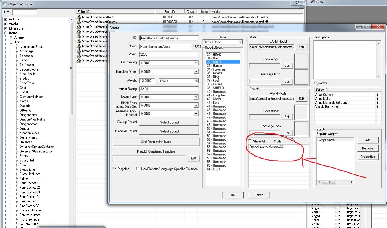 Jetzt habe ich dort die (Armature nennt sich das, denk ich mal...) eingetragen und anschließend sah ich die Rüstung Ingame.