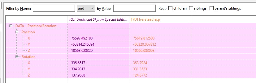 Klicke ich mich dann durch den Baum durch und orieniere mich strikt an dieser Hervorhebung, lande ich zum Ende bei " [05] Unofficial Skyrim Special Edition Patch.esp (F9EF0478) \ Worldspace \ 0000003C <Tamriel> \ Block 0, -1 \ Sub-Block 2, -2 \ 00009781 <IvarsteadExterior04> \ Temporary \ 01900000", wo mir im View Tab Folgendes angezeigt wird.