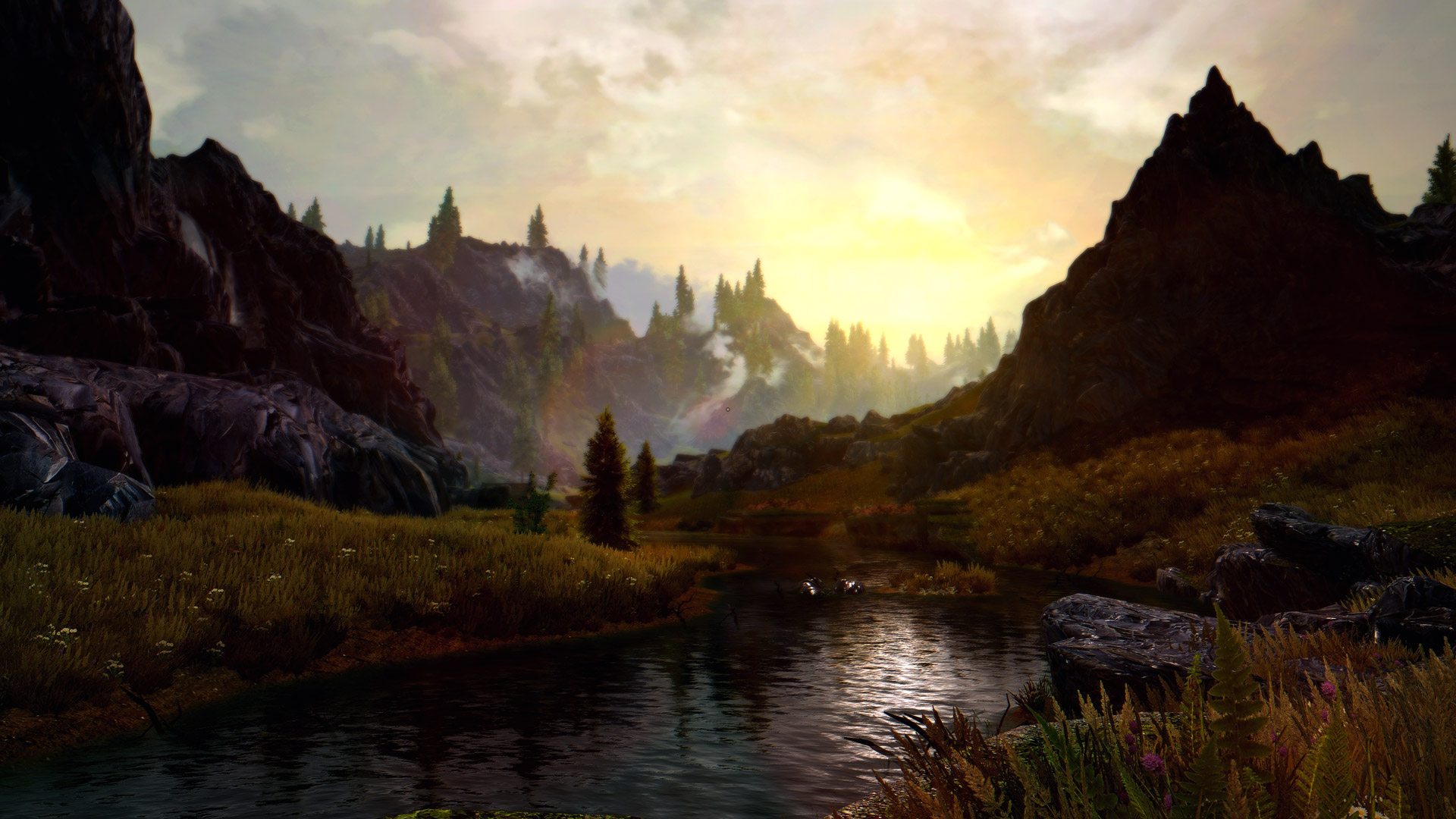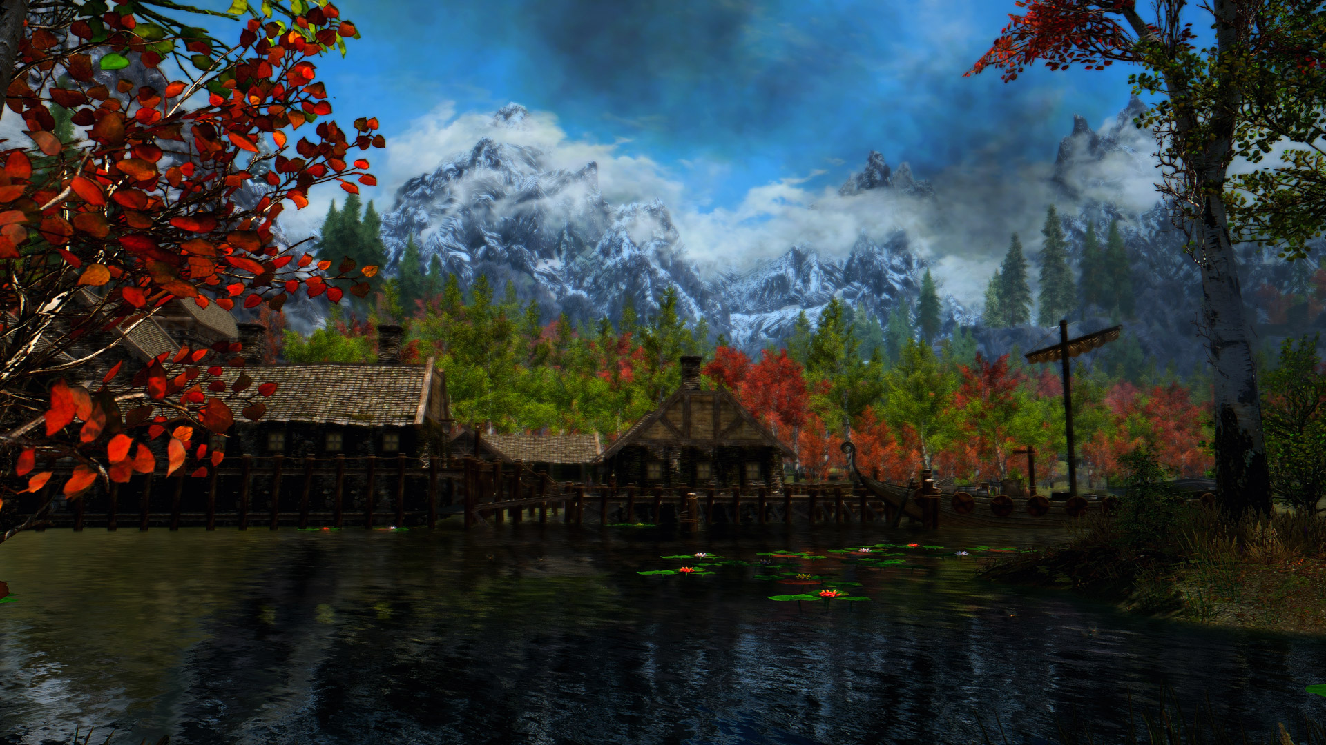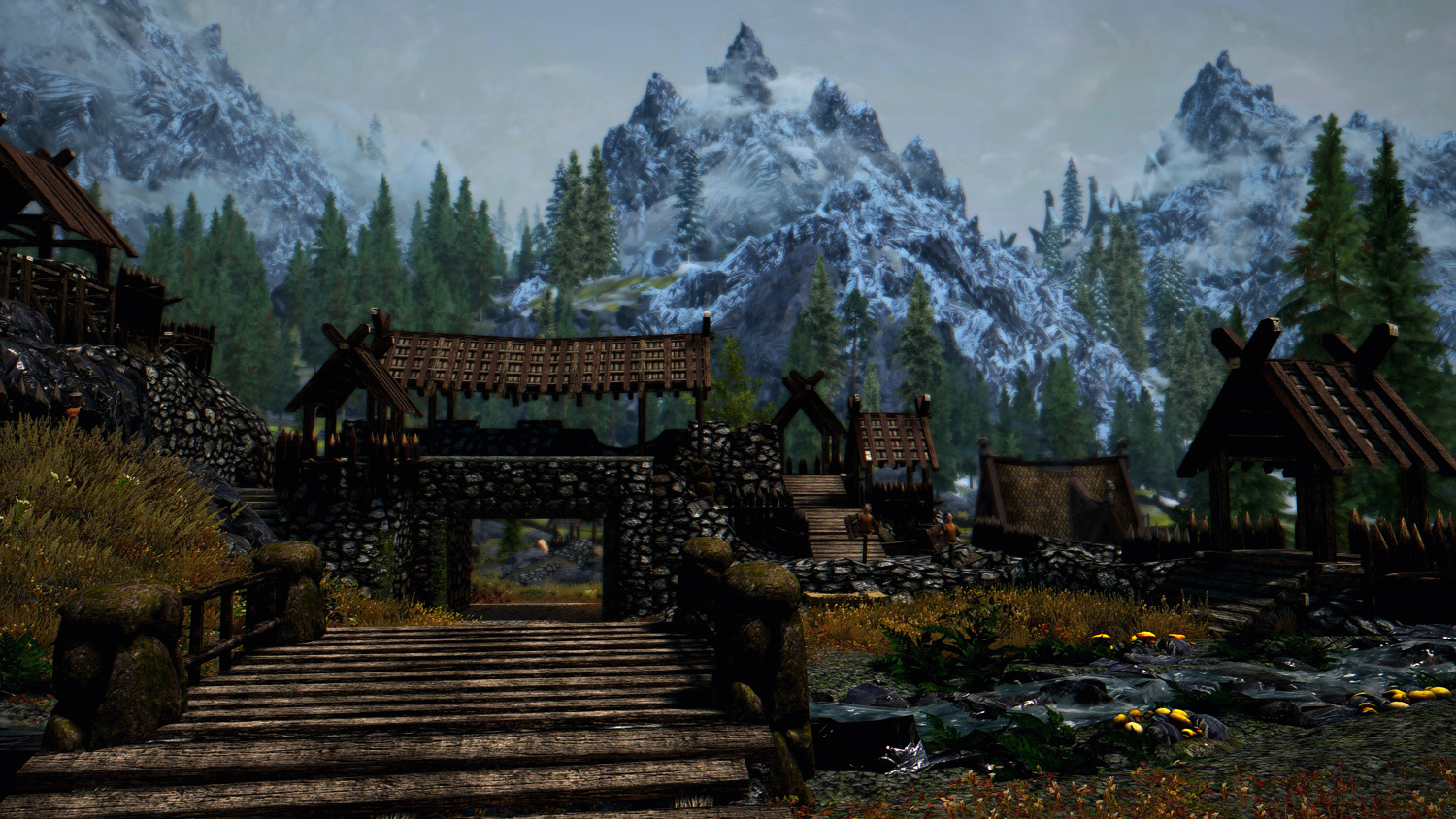 Nachdem ich das Bild mal als Wetter-Fanatiker, der selbst viel daran rumschraubt, genauer angesehen habe, behaupte ich einfach, dass du ein qualitativ minderwertiges Wetter hast. Wetter sind Records, in denen man für 4 Tageszeiten separat verschiedene Farben von Horizont, Himmel, Wolken, Nebeln und andere einstellen kann, was auch die Schnee-, Wasser- und Hautfarben beinflusst. Auch Weitsicht hat damit etwas zu tun und Weitsicht mit Performance.Allerdings finde ich, dass die Farben im Spiel jetzt insgesamt übersättigt wirken, der Nebel ist teilweise immer noch etwas zu dunkel, und teilweise ist das Lighting ziemlich weird, so wie hier, aufgenommen vom Throat of the World, bei Tag, um ca 15 Uhr: