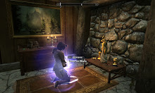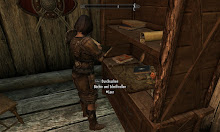 Ein Wort zum Holz: Neben dem Holzklotz hinter dem Haus befindet sich ein Holzhaufen „Holz nehmen“, wo der Spieler Holz auf dem Arm stapelt und neben dem Kamin im Haus ein kleiner Holzstapel „Holz ablegen“, wo es wieder abgelegt werden kann. Die Animationen funktionieren auch andersrum, was wohl so im (vanilla-) Script definiert ist, das anscheinend abfragt, ob man Holz im Inventar hat oder nicht, aber es macht dann eher wenig Sinn. Ebenso kann man das Holz, was man am Holzklotz gehackt hat, beim „Holz nehmen“ erst mal ablegen (Holz ist dabei nicht auf dem Arm sichtbar), bevor man es durch erneutes Anklicken wieder nimmt.
