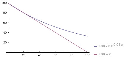 Wenn du 100*0,75^0,05x statt 100*0,8^0,05x rechnest, ist insgesamt etwas mehr drin: