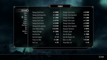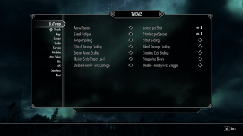 Ich bin heute beim stöbern aufm Nexus auf die Mod SkyTweak gestoßen. Der Funktionsumfang ist sehr groß, da man über das Mod-Menü von SkyUI allerhand verschiedene Einstellungen ändern kann. So kann man zum Beispiel den Schwierigkeitsgrad besser anpassen (z.B. wie viel mehr Schaden man nimmt/austeilt wenn man die Schwierigkeitsstufe "Legendär" wählt), wie viel Schaden Pfeile im Schleichmodus anrichten, generell viele Schadenseinstellungen ändern, und und und. Schaut euch am beste die Screens auf Nexus an. Ich bin selber immer noch damit beschäftigt, mich durch die ganzen Einstellungsmöglichkeiten zu kämpfen.
