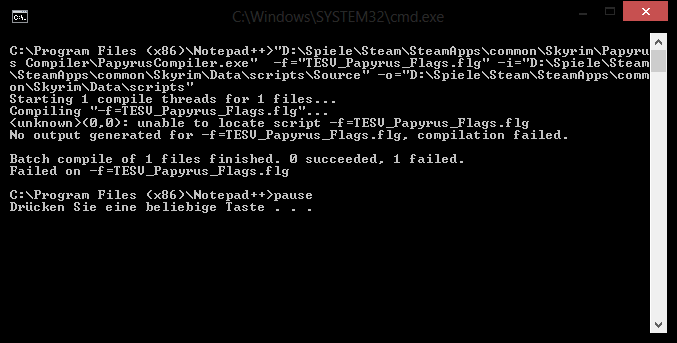 "C:\Program Files (x86)\Steam\SteamApps\common\Skyrim\Papyrus Compiler\PapyrusCompiler.exe" %1 -i="C:\Program Files (x86)\Steam\SteamApps\common\Skyrim\Data\Scripts\Source" -o="C:\Program Files (x86)\Steam\SteamApps\common\Skyrim\Data\Scripts" -f="C:\Program Files (x86)\Steam\SteamApps\common\Skyrim\Papyrus Compiler\TESV_Papyrus_Flags.flg"