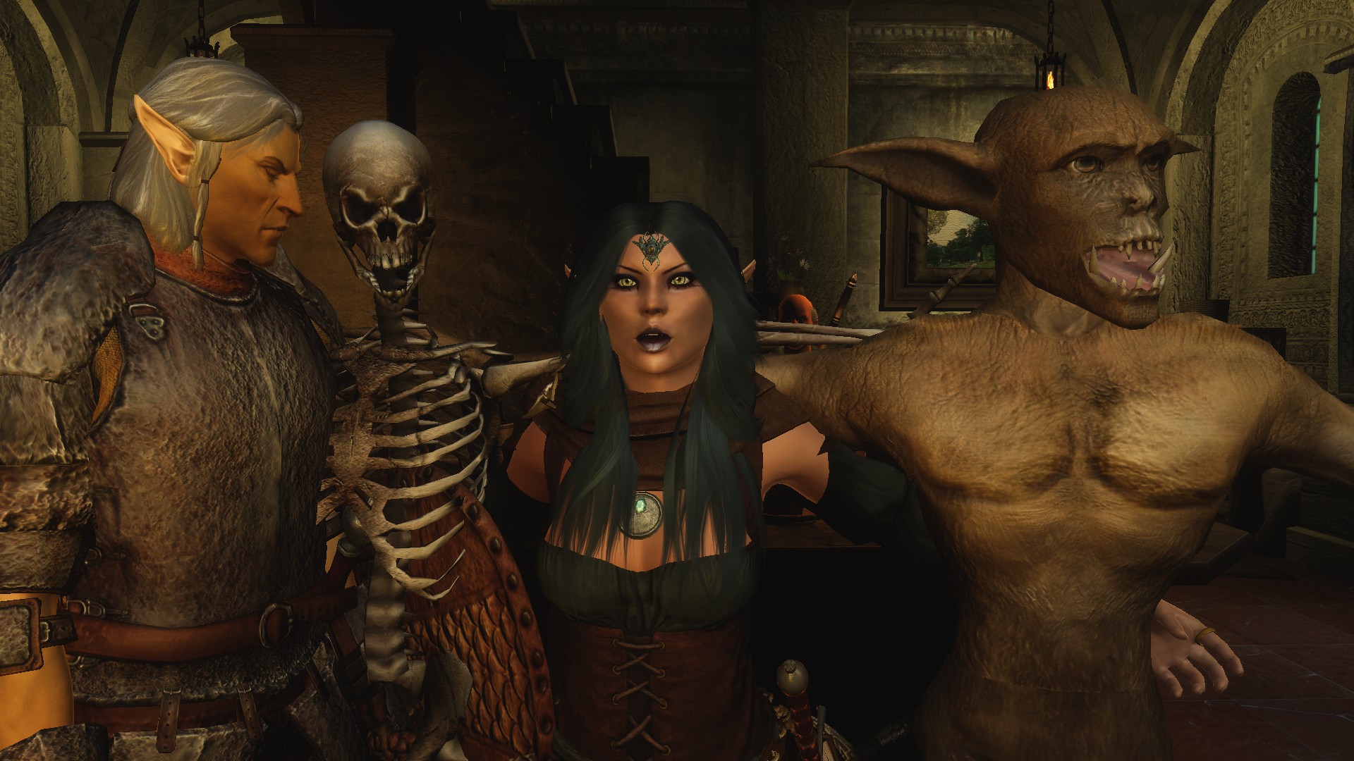 Das Portrait ist mir misslungen. Sheogorath allein weiß, warum ich mir in den Kopf gesetzt habe, möglichst nah an das Gesicht des Argoniers zu kommen! Nicht nur sind die Standardgesichter von ihrer Auflösung her für solche "Extrem-Nah-Aufnahmen" nicht geeignet (zumal man den Fehler beim Ohrring in dieser Aufnahme deutlich sieht), auch die gesamte Pose und der Ort missfallen mir: