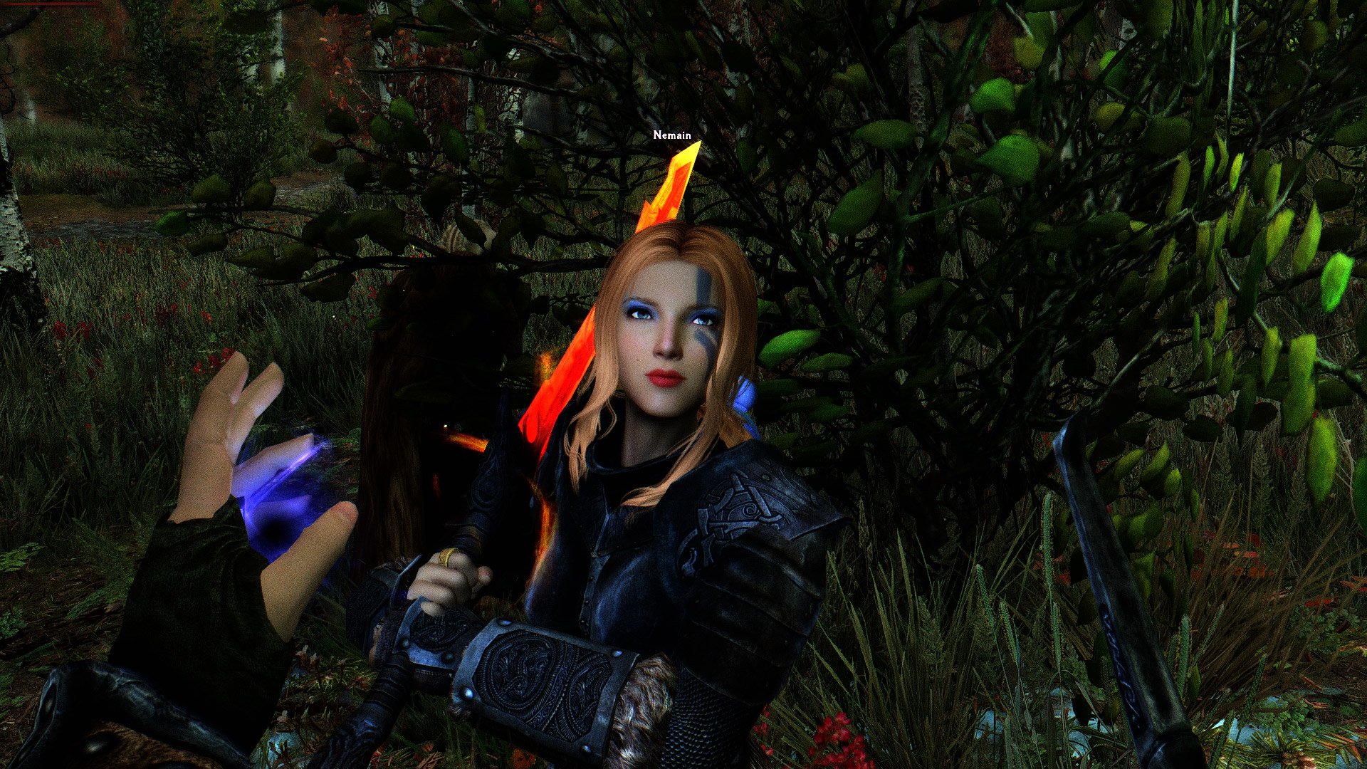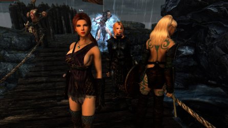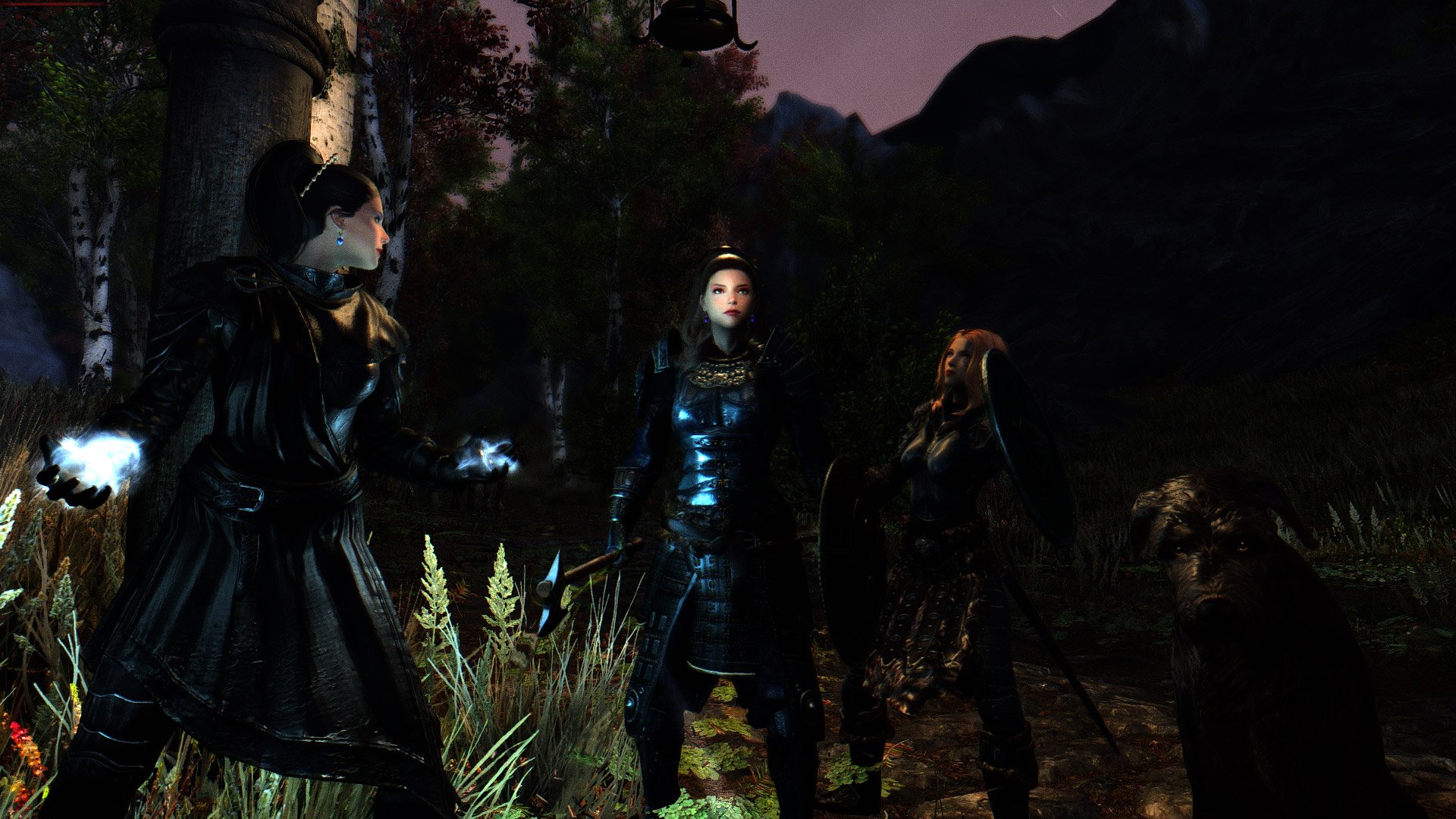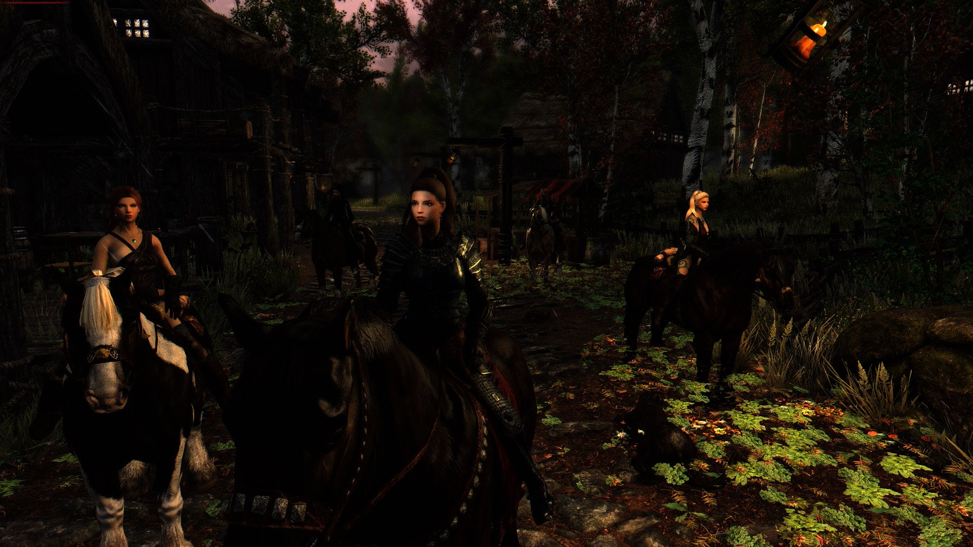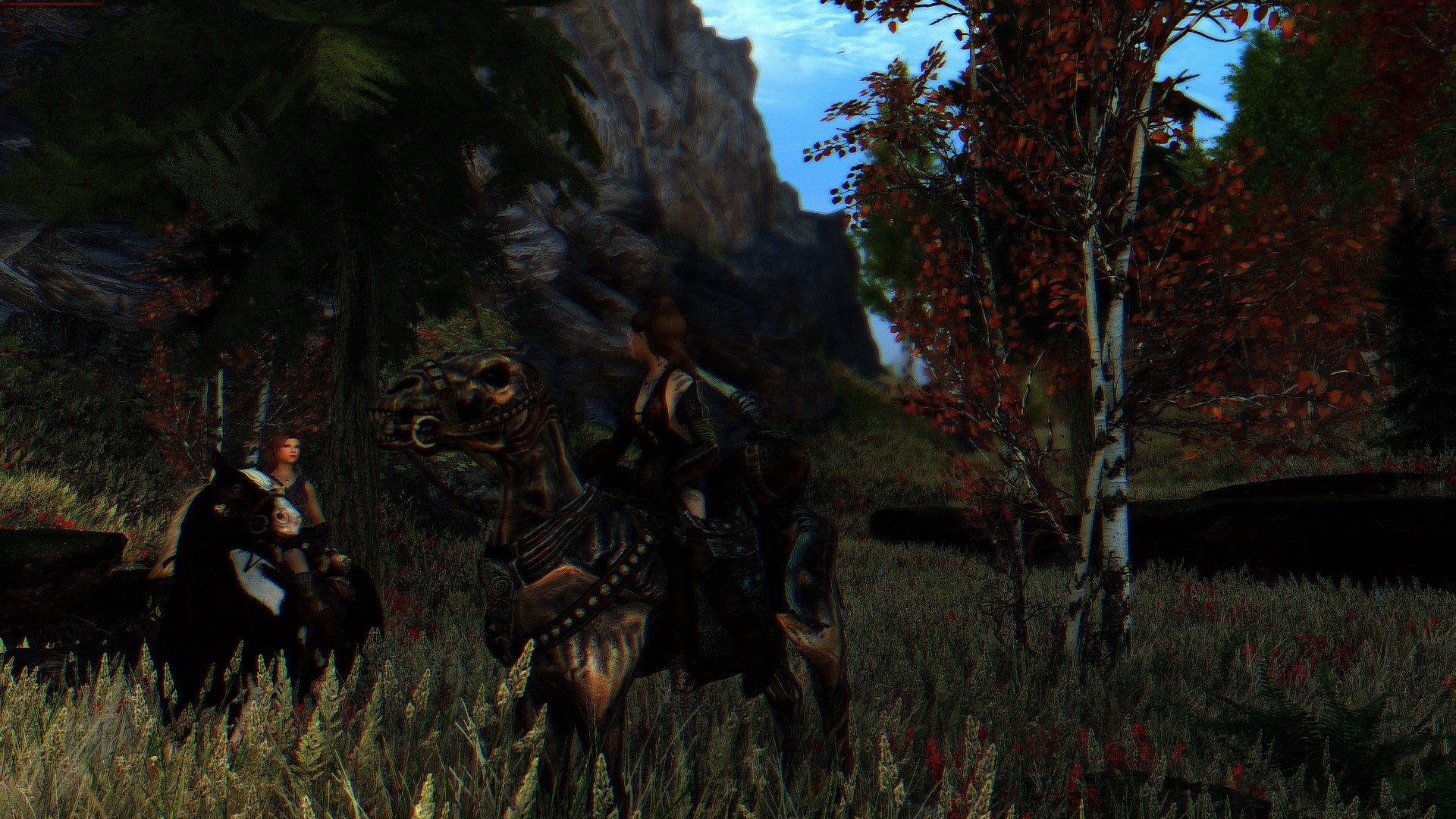 Anyway, bin gerade in Falskaar, wo Freud und Leid eines voll gemoddeten Skyrim aufeinandertreffen. Ich liebe das schöne Falskaar, vielleicht gerade, weil es nicht so überstellt ist wie das Hauptspiel, wo man alle paar Meter vom Gaul steigen muss, um in ein Dungeon zu gehen. Diese Wälder sind das ideale Reiter-Paradies. Leider erinnert das Reiten oft an Slapstick, statt an das, was man sich aus dem Kino gewöhnt ist, wenn eine Truppe von 5 Leuten zusammen reitet. Ich kann ein paar dekorative Screenshots von meiner Truppe (Illia, Nemain, Tamaria und Sofia) auf dem Gaul machen, aber wenn ich einfach im vollen Galopp losreite, kann ich froh sein, mit einem Reiter im Gefolge anzukommen.