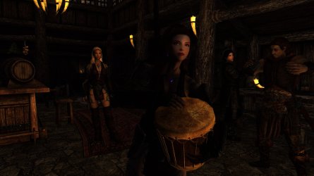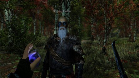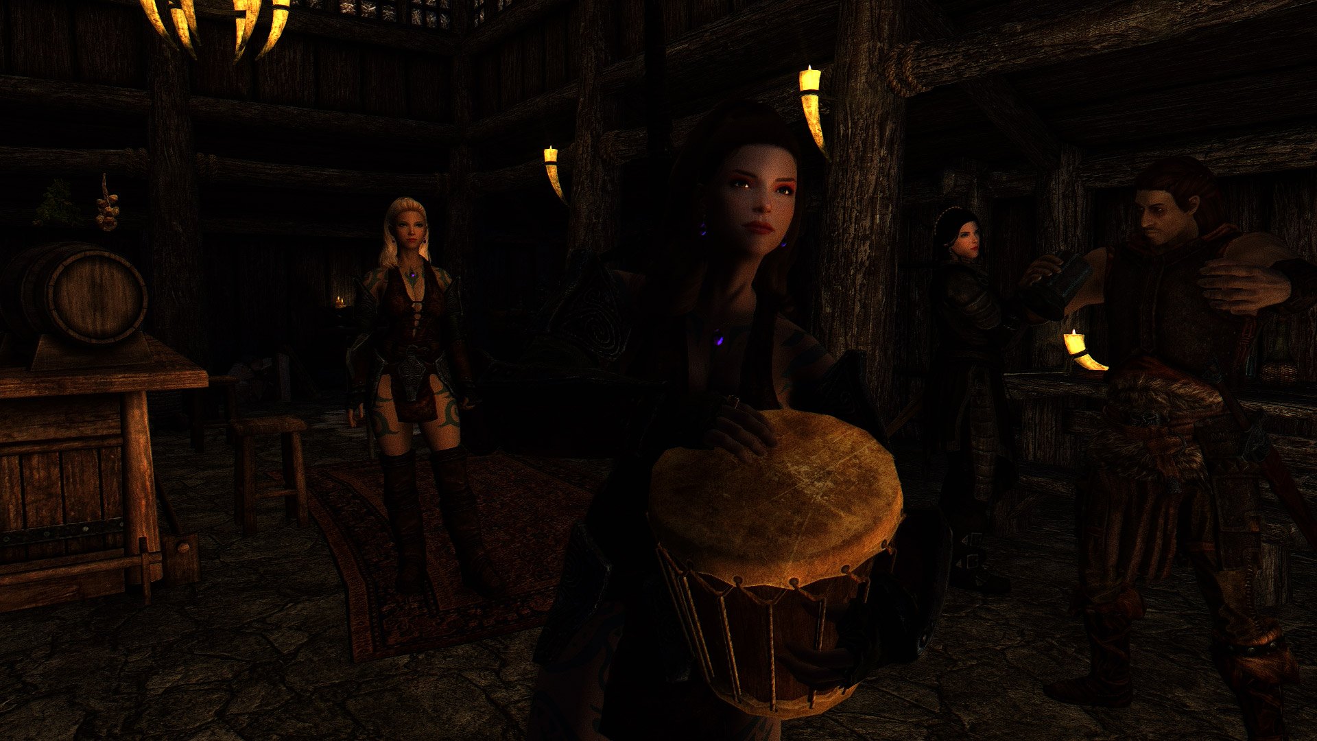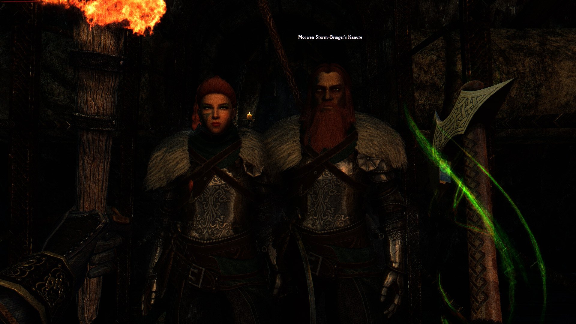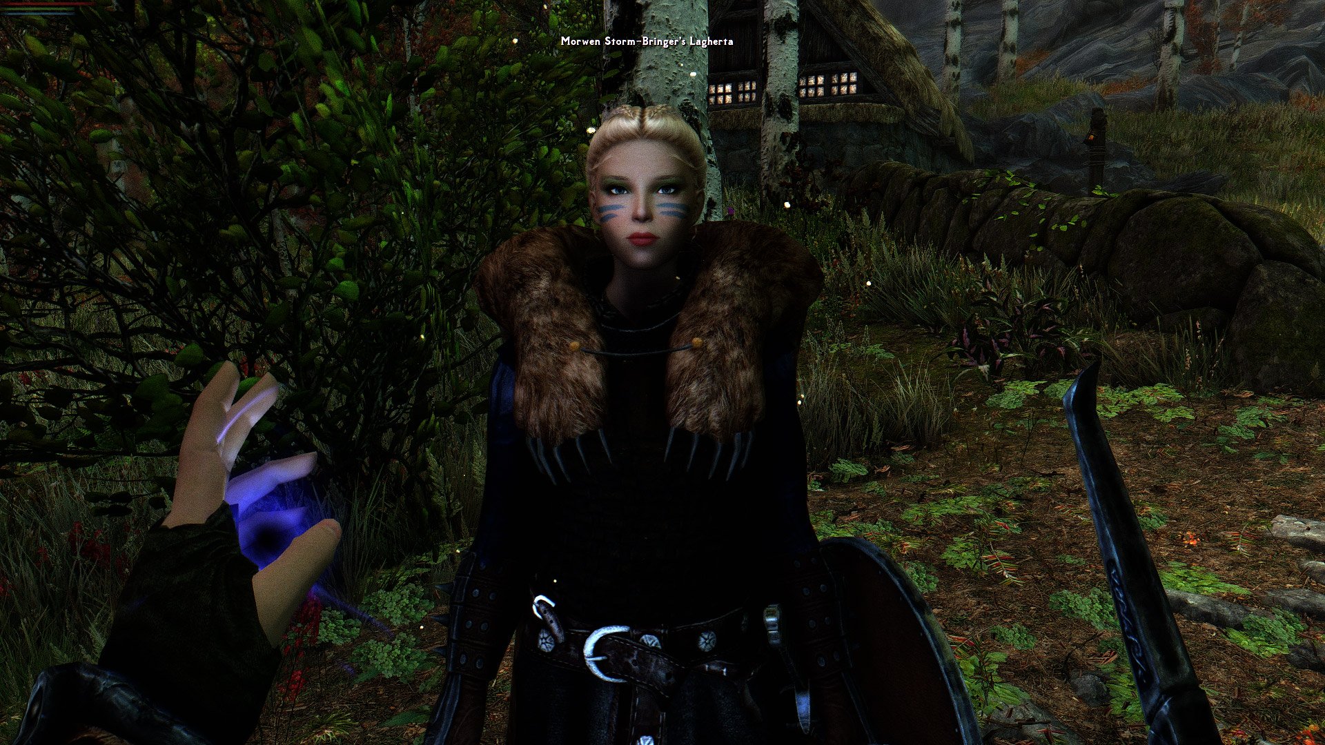 Anyway, bin gerade in Falskaar, wo Freud und Leid eines voll gemoddeten Skyrim aufeinandertreffen. Ich liebe das schöne Falskaar, vielleicht gerade, weil es nicht so überstellt ist wie das Hauptspiel, wo man alle paar Meter vom Gaul steigen muss, um in ein Dungeon zu gehen. Diese Wälder sind das ideale Reiter-Paradies. Leider erinnert das Reiten oft an Slapstick, statt an das, was man sich aus dem Kino gewöhnt ist, wenn eine Truppe von 5 Leuten zusammen reitet. Ich kann ein paar dekorative Screenshots von meiner Truppe (Illia, Nemain, Tamaria und Sofia) auf dem Gaul machen, aber wenn ich einfach im vollen Galopp losreite, kann ich froh sein, mit einem Reiter im Gefolge anzukommen.