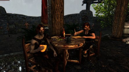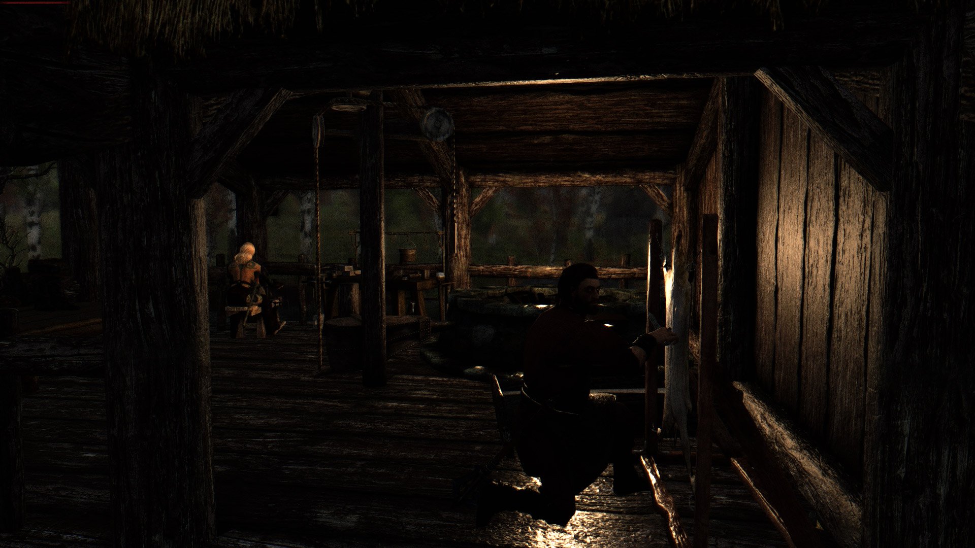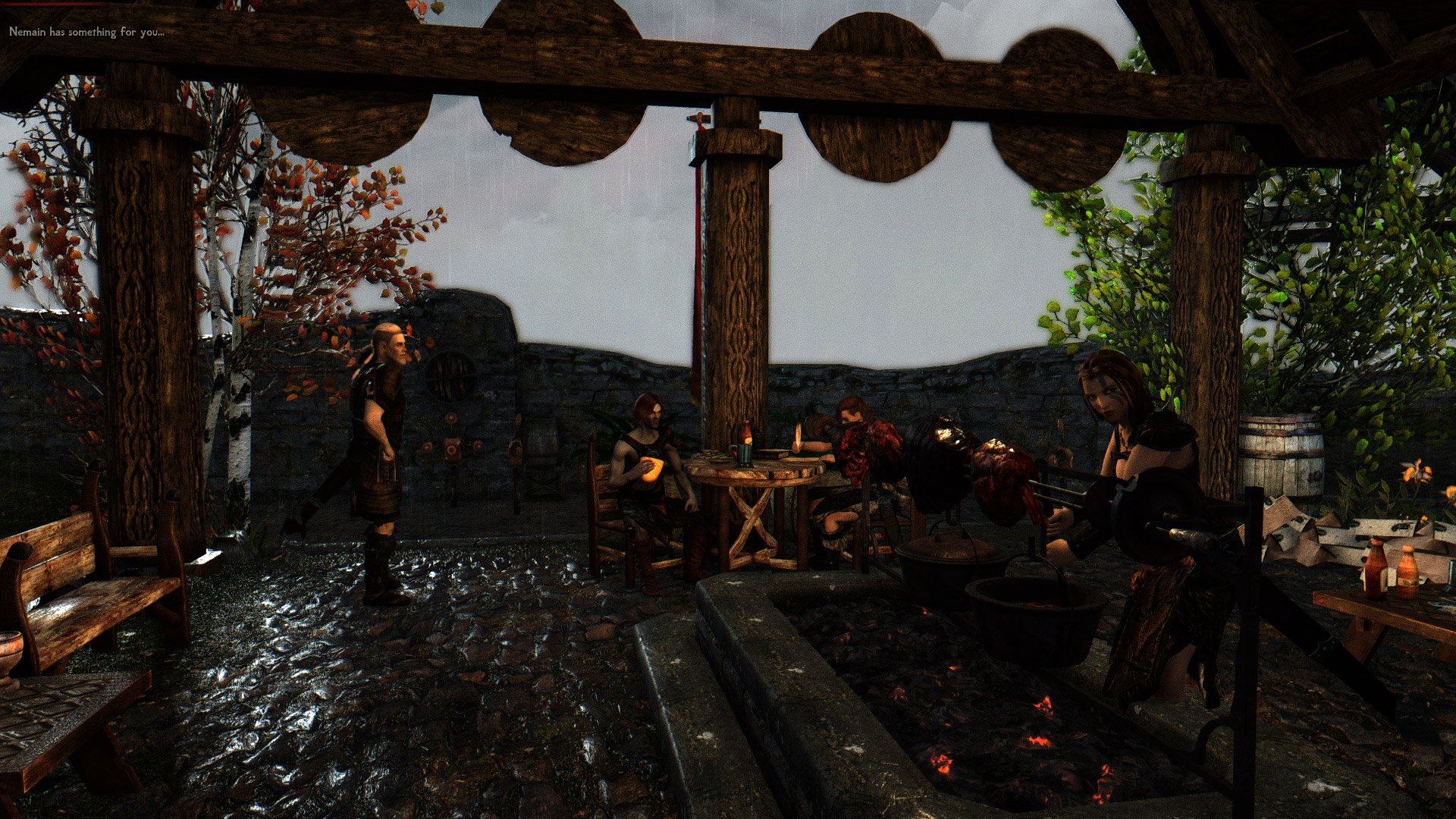 Dafür geniesse ich den Regen in Falskaar, der gerade so gut ist, wie in Fallout 4. Auf meinem HUD hat es Brechungseffekte und Wassertropfen, die runterlaufen, die ganze Umgebung und die NPC kriegen einen nassen Schimmer, indem sich Fackeln und andere Lichter spiegeln, das sieht extrem stimmungsvoll aus. Okay, es checkt noch nicht, wo es ein Dach hat, d.h. auch darunter wird es voll nass, aber selbst das sieht hübsch aus.