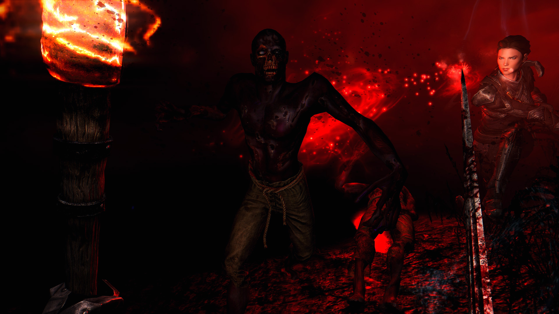 Ist sogar schwer, überhaupt einen Screenshot zu machen, mitten in der Nacht, wenn einem sieben Zombies nachsetzen. Darunter sind Kotzer, die einem die Magier-Regeneration abstellen können, während andere immer noch Äxte tragen können. Ist übrigens peinlich, ich hätte was für solche Ghule in Fallout 4 gegeben, die hier sehen richtig gruselig aus, und um Längen hochwertiger als die peinlichen Fleischklopse im Ödland, die sogar noch mieser aussehen, als solche in Fallout 3. Ich weiss es immer noch nicht, was die geraucht haben, die das Konzept gemacht und abgesegnet haben.