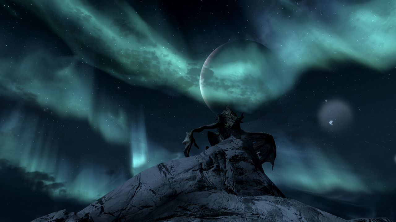 Paarthurnax auf dem Gipfel der Welt vor den Monden Masser und Secunda |