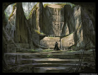 Die Vorhalle, die in einem ähnlichen Stil wie der Außenbereich errichtet wurde, aber im Gegensatz dazu noch weitestgehend intakt ist, wird zentral von einer mächtigen Säule gestützt. Am hinteren Ende dieser Halle haben neben einem Gang in die tieferen Gewölbe später einige Banditen ihr Lager aufgeschlagen.