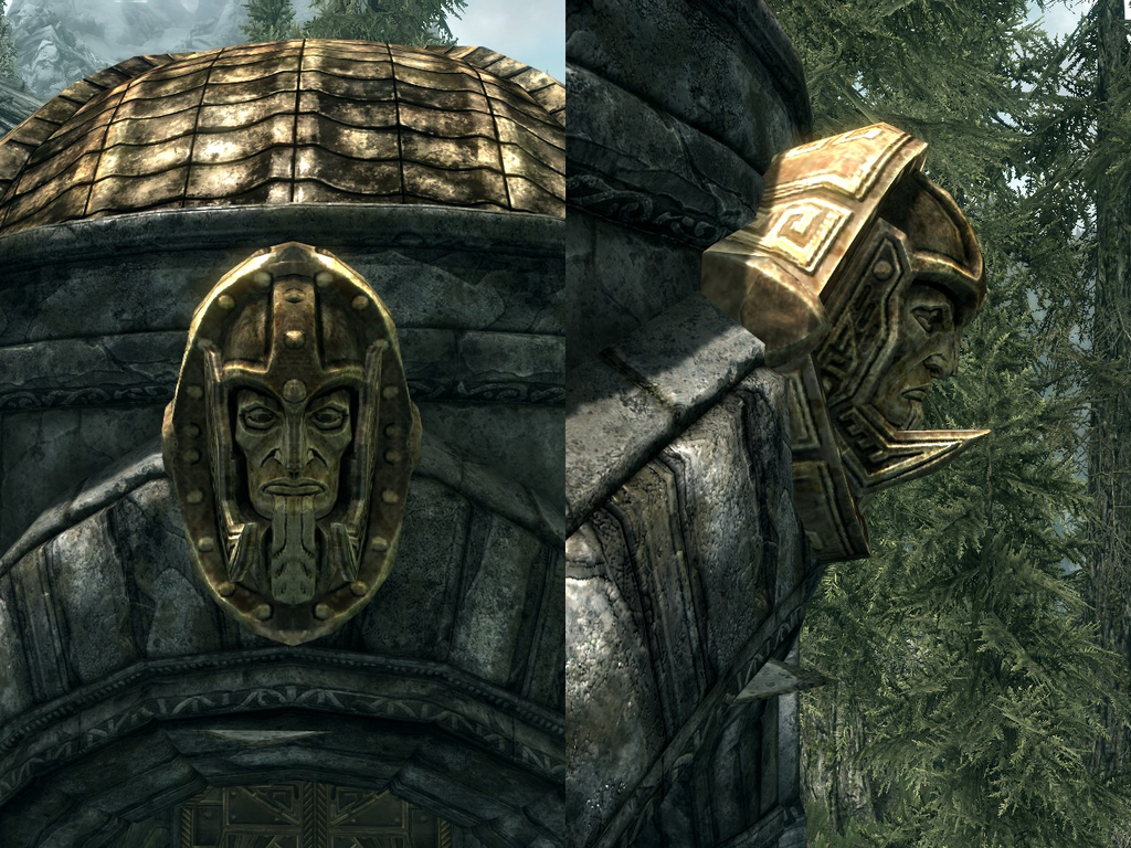 Front- und Seitenansicht eines dwemerischen Kopfes an den Ruinen von Mzulft in Himmelsrand