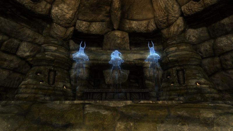 Die Geister der drei Söhne Gauldurs Mikrul Gauldurson, Sigdis Gauldurson und Jyrik Gauldurson (v.l.n.r.) im Grab ihres Vaters im Wasserwindfelsen
