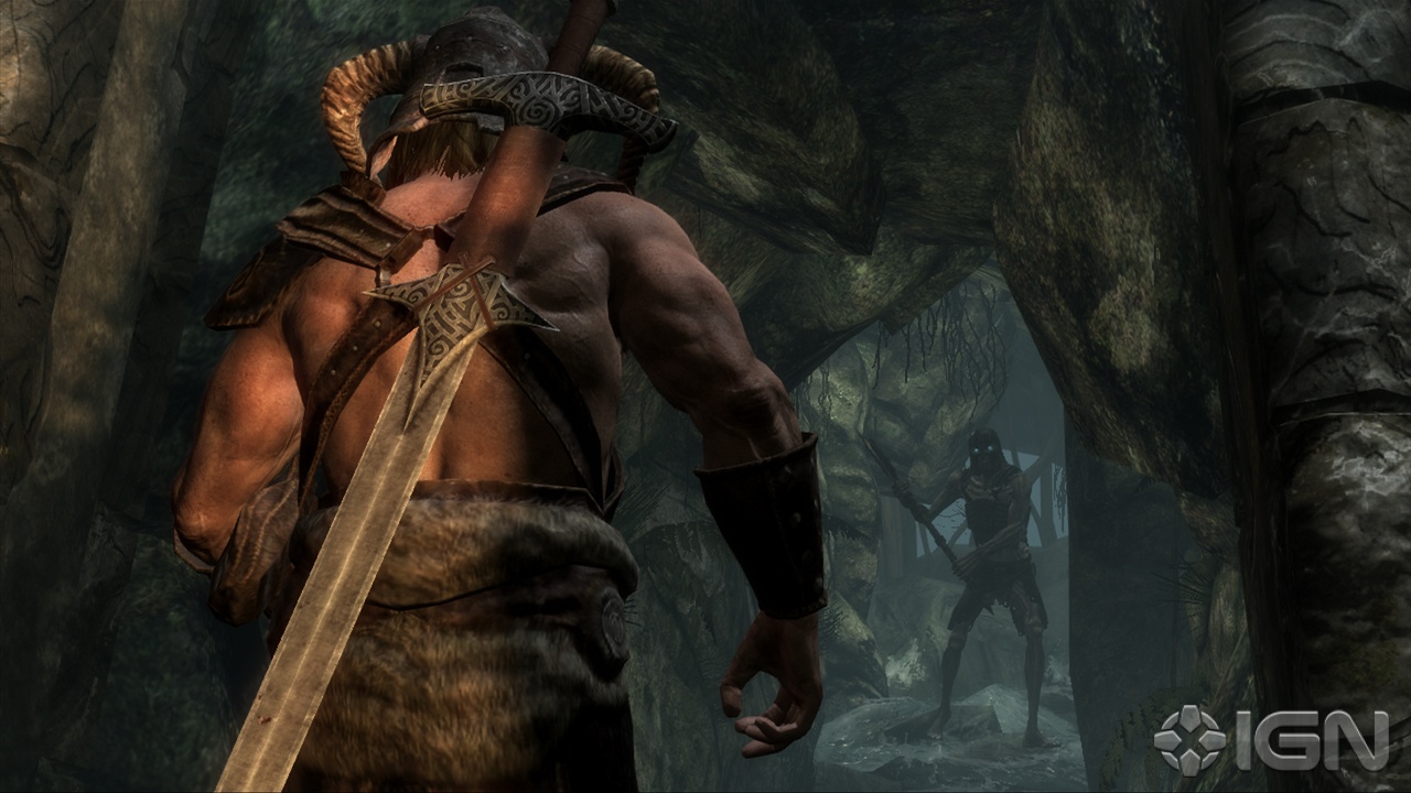 Der Spieler und ein Draugr aus The Elder Scrolls V: Skyrim.
